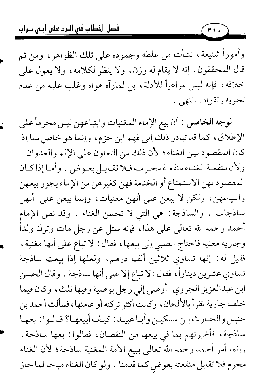 الوجه الخامس: أن بيع الإماء المغنيات وابتياعهن ليس محرماً على الإطلاق، كما قد تبادر ذلك إلى فهم ابن حزم، وإنما هو خاص بما إذا كان المقصود بهن الغناء؛ لأن ذلك من التعاون على الإثم والعدوان. ولأن منفعة الغناء منفعة محرمة فلا تقابل بعوض. وأما إذا كان المقصود بهن الاستمتاع أو الخدمة فهن كغيرهن من الإماء يجوز بيعهن وابتياعهن، ولكن لا يبعن على أنهن مغنيات، وإنما يبعن على أنهن ساذجات. والساذجة: هي التي لا تحسن الغناء. وقد نص الإمام أحمد رحمه الله تعالى على هذا، فإنه سئل عن رجل مات وترك ولداً وجارية مغنية فاحتاج الصبي إلى بيعها، فقال: لا تباع على أنها مغنية، فقيل له: إنها تساوي ثلاثين ألف درهم، ولعلها إذا بيعت ساذجة تساوي عشرين ديناراً، فقال: لا تباع إلا على أنها ساذجة. وقال الحسن ابن عبد العزيز الجروي: أوصى إلي رجل بوصية وفيها ثلث، وكان فيما خلف جارية تقرأ بالألحان، وكانت أكثر تركته أو عامتها، فسألت أحمد بن حنبل والحارث بن مسكين وأبا عبيد: كيف أبيعها؟ قالوا: بعها ساذجة، فأخبرتهم بما في بيعها من النقصان، فقالوا: بعها ساذجة. وإنما أمر أحمد رحمه الله تعالى ببيع الأمة المغنية ساذجة؛ لأن الغناء محرم فلا تقابل منفعته بعوضٍ كما قدمنا. ولو كان الغناء مباحا لما جاز