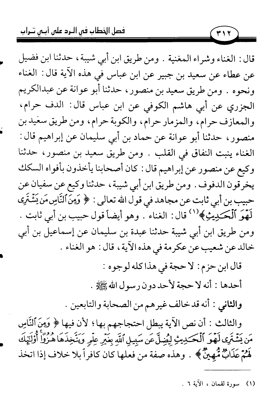 قال: الغناء وشراء المغنية. ومن طريق ابن أبي شيبة، حدثنا ابن فضيل عن عطاء عن سعيد بن جبير عن ابن عباس في هذه الآية قال: الغناء ونحوه. ومن طريق سعيد بن منصور، حدثنا أبو عوانة عن عبد الكريم الجزري عن أبي هاشم الكوفي عن ابن عباس قال: الدف حرام، والمعازف حرام، والمزمار حرام، والكوبة حرام، ومن طريق سعيد بن منصور، حدثنا أبو عوانة عن حماد بن أبي سليمان عن إبراهيم قال: الغناء ينبت النفاق في القلب. ومن طريق سعيد بن منصور، حدثنا وكيع عن منصور عن إبراهيم قال: كان أصحابنا يأخذون بأفواه السكك يخرقون الدفوف. ومن طريق ابن أبي شيبة حدثنا وكيع عن سفيان عن حبيب بن أبي ثابت عن مجاهد في قول الله تعالى: {وَمِنَ النَّاسِ مَن يَشْتَرِي لَهْوَ الْحَدِيثِ} (¬1) قال: الغناء. وهو أيضاً قول حبيب بن أبي ثابت. ومن طريق ابن أبي شيبة حدثنا عبدة بن سليمان عن إسماعيل بن أبي خالد عن شعيب عن عكرمة في هذه الآية، قال: هو الغناء.