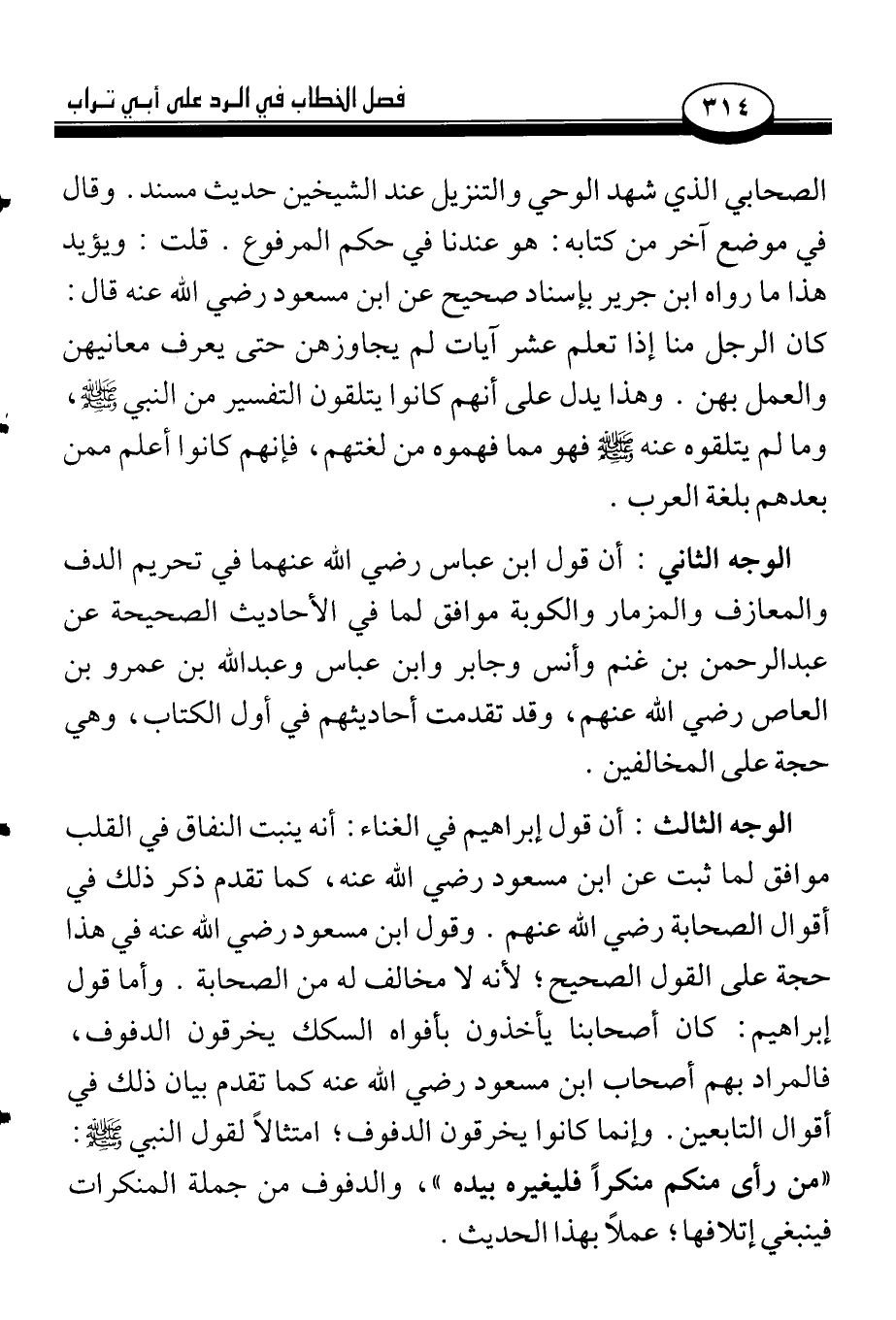 الوجه الثالث: أن قول إبراهيم في الغناء: أنه ينبت النفاق في القلب موافق لما ثبت عن ابن مسعود رضي الله عنه، كما تقدم ذكر ذلك في أقوال الصحابة رضي الله عنهم. وقول ابن مسعود رضي الله عنه في هذا حجة على القول الصحيح؛ لأنه لا مخالف له من الصحابة. وأما قول إبراهيم: كان أصحابنا يأخذون بأفواه السكك يخرقون الدفوف، فالمراد بهم أصحاب ابن مسعود رضي الله عنه كما تقدم بيان ذلك في أقوال التابعين. وإنما كانوا يخرقون الدفوف؛ امتثالاً لقول النبي صلى الله عليه وسلم: «من رأى منكم منكراً فليغيره بيده»، والدفوف من جملة المنكرات فينبغي إتلافها؛ عملاً بهذا الحديث.
