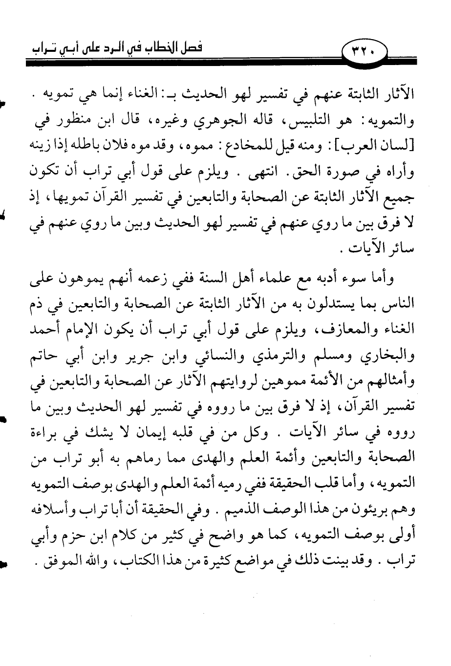 وأما سوء أدبه مع علماء أهل السنة ففي زعمه أنهم يموهون على الناس بما يستدلون به من الآثار الثابتة عن الصحابة والتابعين في ذم الغناء والمعازف، ويلزم على قول أبي تراب أن يكون الإمام أحمد والبخاري ومسلم والترمذي والنسائي وابن جرير وابن أبي حاتم وأمثالهم من الأئمة مموهين لروايتهم الآثار عن الصحابة والتابعين في تفسير القرآن، إذ لا فرق بين ما رووه في تفسير لهو الحديث وبين ما رووه في سائر الآيات. وكل من في قلبه إيمان لا يشك في براءة الصحابة والتابعين وأئمة العلم والهدى مما رماهم به أبو تراب من التمويه، وأما قلب الحقيقة ففي رميه أئمة العلم والهدى بوصف التمويه وهم بريئون من هذا الوصف الذميم. وفي الحقيقة أن أبا تراب وأسلافه أولى بوصف التمويه، كما هو واضح في كثير من كلام ابن حزم وأبي تراب. وقد بينت ذلك في مواضع كثيرة من هذا الكتاب، والله الموفق.