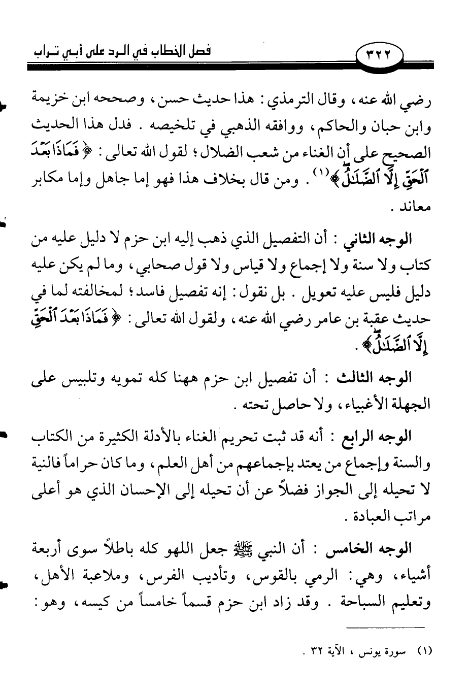 رضي الله عنه، وقال الترمذي: هذا حديث حسن، وصححه ابن خزيمة وابن حبان والحاكم، ووافقه الذهبي في تلخيصه. فدل هذا الحديث الصحيح على أن الغناء من شعب الضلال؛ لقول الله تعالى: {فَمَاذَا بَعْدَ الْحَقِّ إِلاَّ الضَّلاَلُ} (¬1). ومن قال بخلاف هذا فهو إما جاهل وإما مكابر معاند.