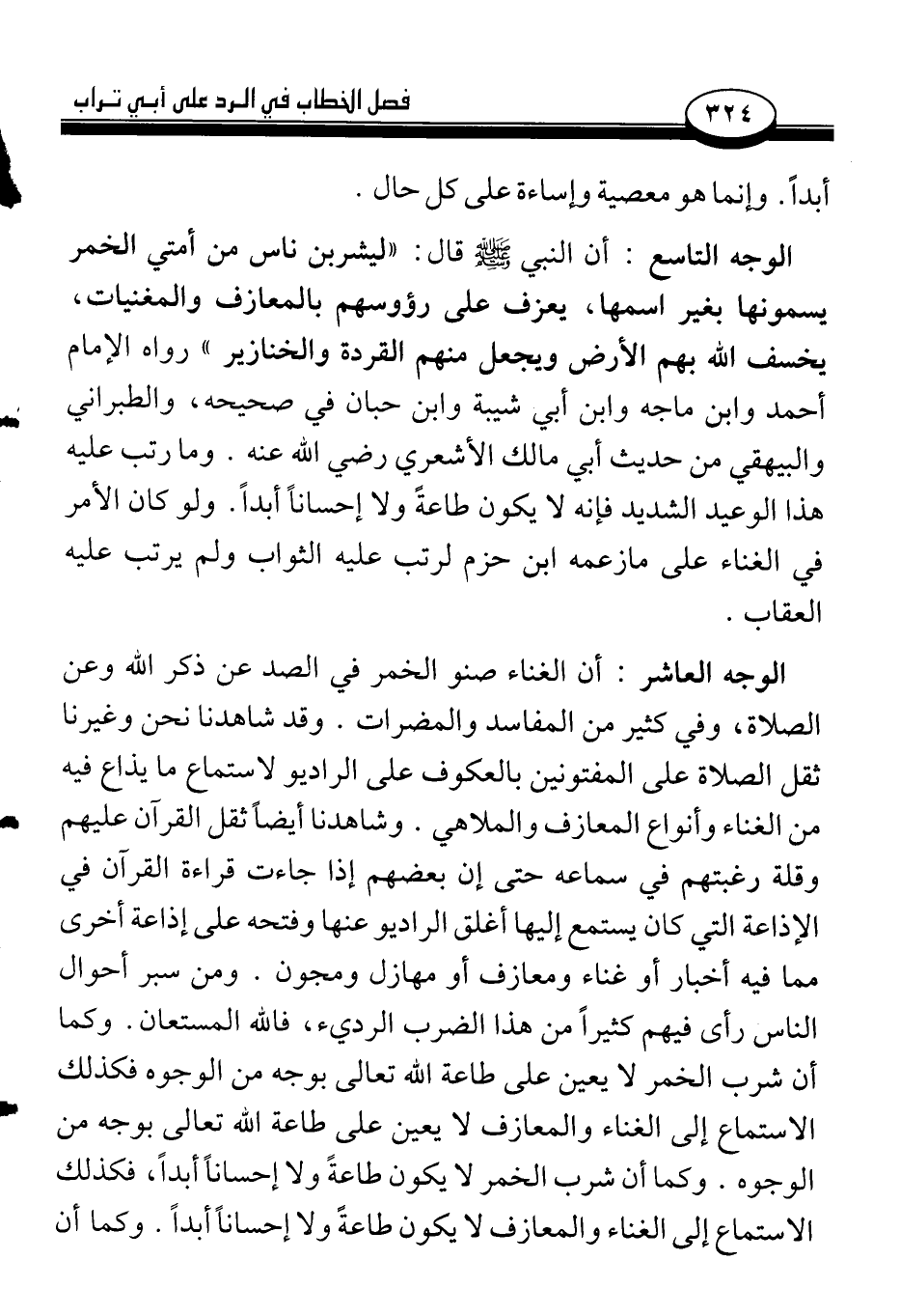 الوجه التاسع: أن النبي صلى الله عليه وسلم قال: «ليشربن ناس من أمتي الخمر يسمونها بغير اسمها، يعزف على رؤوسهم بالمعازف والمغنيات، يخسف الله بهم الأرض ويجعل منهم القردة والخنازير» رواه الإمام أحمد وابن ماجه وابن ابي شيبة وابن حبان في صحيحه، والطبراني والبيهقي من حديث أبي مالك الأشعري رضي الله عنه. وما رتب عليه هذا الوعيد الشديد فإنه لا يكون طاعةً ولا إحساناً أبداً. ولو كان الأمر في الغناء على ما زعمه ابن حزم لرتب عليه الثواب ولم يرتب عليه العقاب.