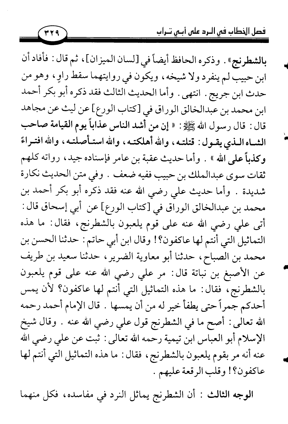بالشطرنج». وذكره الحافظ أيضاً في [لسان الميزان]، ثم قال: فأفاد أن ابن حبيب لم ينفرد ولا شيخه، ويكون في روايتهما سقط راوٍ، وهو من حدث ابن جريج. انتهى. وأما الحديث الثالث فقد ذكره أبو بكر أحمد ابن محمد بن عبد الخالق الوراق في [كتاب الورع] عن ليث عن مجاهد قال: قال رسول الله صلى الله عليه وسلم: «إن من أشد الناس عذاباً يوم القيامة صاحب الشاه الذي يقول: قتلته، والله أهلكته، والله استأصلته، والله افتراءً وكذباً على الله». وأما حديث عقبة بن عامر فإسناده جيد، رواته كلهم ثقات سوى عبد الملك بن حبيب ففيه ضعف. وفي متن الحديث نكارة شديدة. وأما حديث علي رضي الله عنه فقد ذكر أبو بكر أحمد بن محمد بن عبد الخالق الوراق في [كتاب الورع] عن أبي إسحاق قال: أتى علي رضي الله عنه على قوم يلعبون بالشطرنج، فقال: ما هذه التماثيل التي أنتم لها عاكفون؟! وقال ابن أبي حاتم: حدثنا الحسن بن محمد بن الصباح، حدثنا أبو معاوية الضرير، حدثنا سعيد بن طريف عن الأصبغ بن نباتة قال: مر علي رضي الله عنه على قوم يلعبون بالشطرنج، فقال: ما هذه التماثيل التي أنتم لها عاكفون؟ لأن يمس أحدكم جمراً حتى يطفأ خير له من أن يمسها. قال الإمام أحمد رحمه الله تعالى: أصح ما في الشطرنج قول علي رضي الله عنه. وقال شيخ الإسلام أبو العباس ابن تيمية رحمه الله تعالى: ثبت عن علي رضي الله عنه أنه مر على قوم يلعبون بالشطرنج، فقال: ما هذه التماثيل التي أنتم لها عاكفون؟! وقلب الرقعة عليهم.
