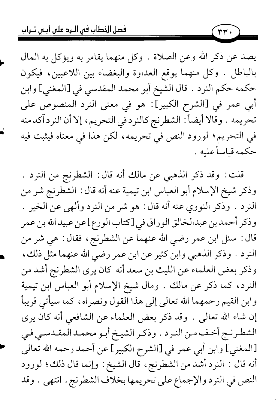 يصد عن ذكر الله وعن الصلاة. وكل منهما يقامر به ويؤكل به المال بالباطل. وكل منهما يوقع العداوة والبغضاء بين اللاعبين، فيكون حكمه حكم النرد. قال الشيخ أبو محمد المقدسي في [المغني] وابن عمر في [الشرح الكبير]: هو في معنى النرد المنصوص على تحريمه. وقالا أيضاً: الشطرنج كالنرد في التحريم، إلا أن النرد آكد منه في التحري؛ لورود النص في تحريمه، لكن هذا في معناه فيثبت فيه حكمه قياساً عليه.