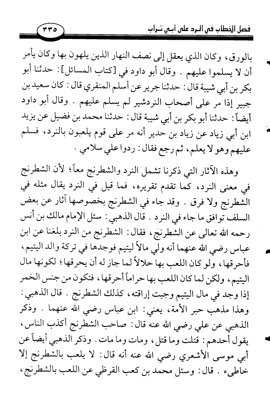 بالورق، وكان الذي يعقل إلى نصف النهار الذين يلهون بها وكان يأمر أن لا يسلموا عليهم. وقال أبو داود في [كتاب المسائل]: حدثنا أبو بكر بن أبي شيبة قال: حدثنا جرير عن أسلم المنقري قال: كان سعيد بن جبير إذا مر على أصحاب النردشير لم يسلم عليهم. وقال أبو داود أيضاً: حدثنا أبو بكر بن شيبة قال: حدثنا محمد بن فضيل عن يزيد ابن أبي زياد عن زياد بن حدير أنه مر على قوم يلعبون بالنرد، فسلم عليهم وهو لا يعلم، ثم رجع فقال: ردوا علي سلامي.