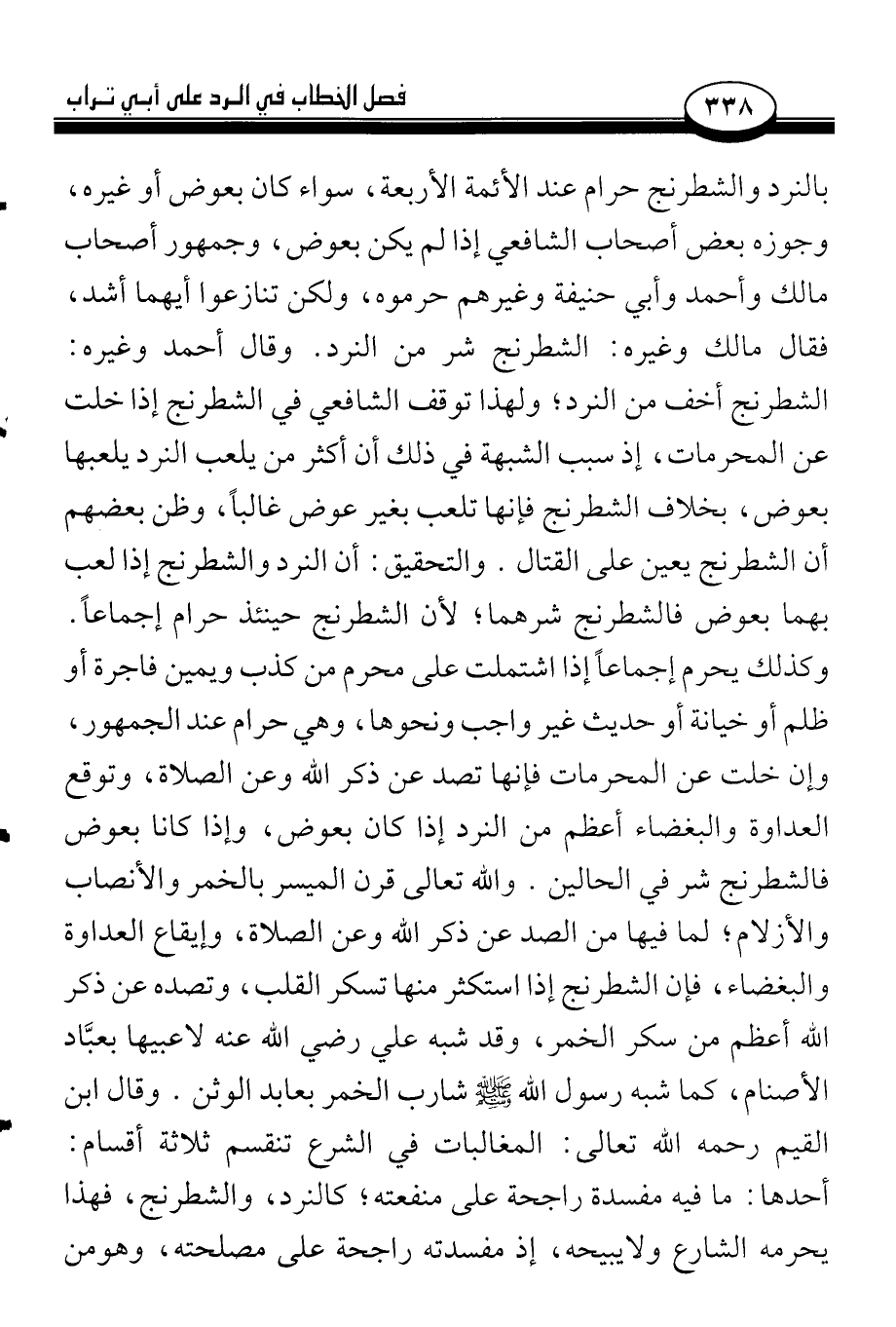 بالنرد والشطرنج حرام عند الأئمة الأربعة، سواء كان بعوض أو غيره، وجوزه بعض أصحاب الشافعي إذا لم يكن بعوض، وجمهور أصحاب مالك وأحمد وأبي حنيفة وغيرهم حرموه، ولكن تنازعوا أيهما أشد، فقال مالك وغيره: الشطرنج شر من النرد. وقال أحمد وغيره: الشطرنج أخف من النرد؛ ولهذا توقف الشافعي في الشطرنج إذا خلت عن المحرمات، إذ سبب الشبهة في ذلك أن أكثر من يلعب النرد يلعبها بعوض، بخلاف الشطرنج فإنها تلعب بغير عوض غالباً، وظن بعضهم أن الشطرنج يعين على القتال. والتحقيق: أن النرد والشطرنج إذا لعب بهما بعوض فالشطرنج شرهما؛ لأن الشطرنج حينئذ حرام إجماعاً. وكذلك يحرم إجماعاً إذا اشتملت على محرم من كذب ويمين فاجرة أو ظلم أو خيانة أو حديث غير واجب ونحوها، وهي حرام عند الجمهور، وإن خلت عن المحرمات فإنها تصد عن ذكر الله وعن الصلاة، وتوقع العداوة والبغضاء أعظم من النرد إذا كان بعوض، وإذا كانا بعوض فالشطرنج شر في الحالين. والله تعالى قرن الميسر بالخمر والأنصاب والأزلام؛ لما فيها من الصد عن ذكر الله وعن الصلاة، وإيقاع العداوة والبغضاء، فإن الشطرنج إذا استكثر منها تسكر القلب، وتصده عن ذكر الله أعظم من سكر الخمر، وقد شبه علي رضي الله عنه لاعبيها بعبَّاد الأصنام، كما شبه رسول الله صلى الله عليه وسلم شارب الخمر بعابد الوثن. وقال ابن القيم رحمه الله تعالى: المغالبات في الشرع تنقسم ثلاثة أقسام: أحدها: ما فيه مفسدة راجحة على منفعته؛ كالنرد، والشطرنج، فهذا يحرمه الشارع ولا يبيحه، إذ مفسدته راجحة على مصلحته، وهو من