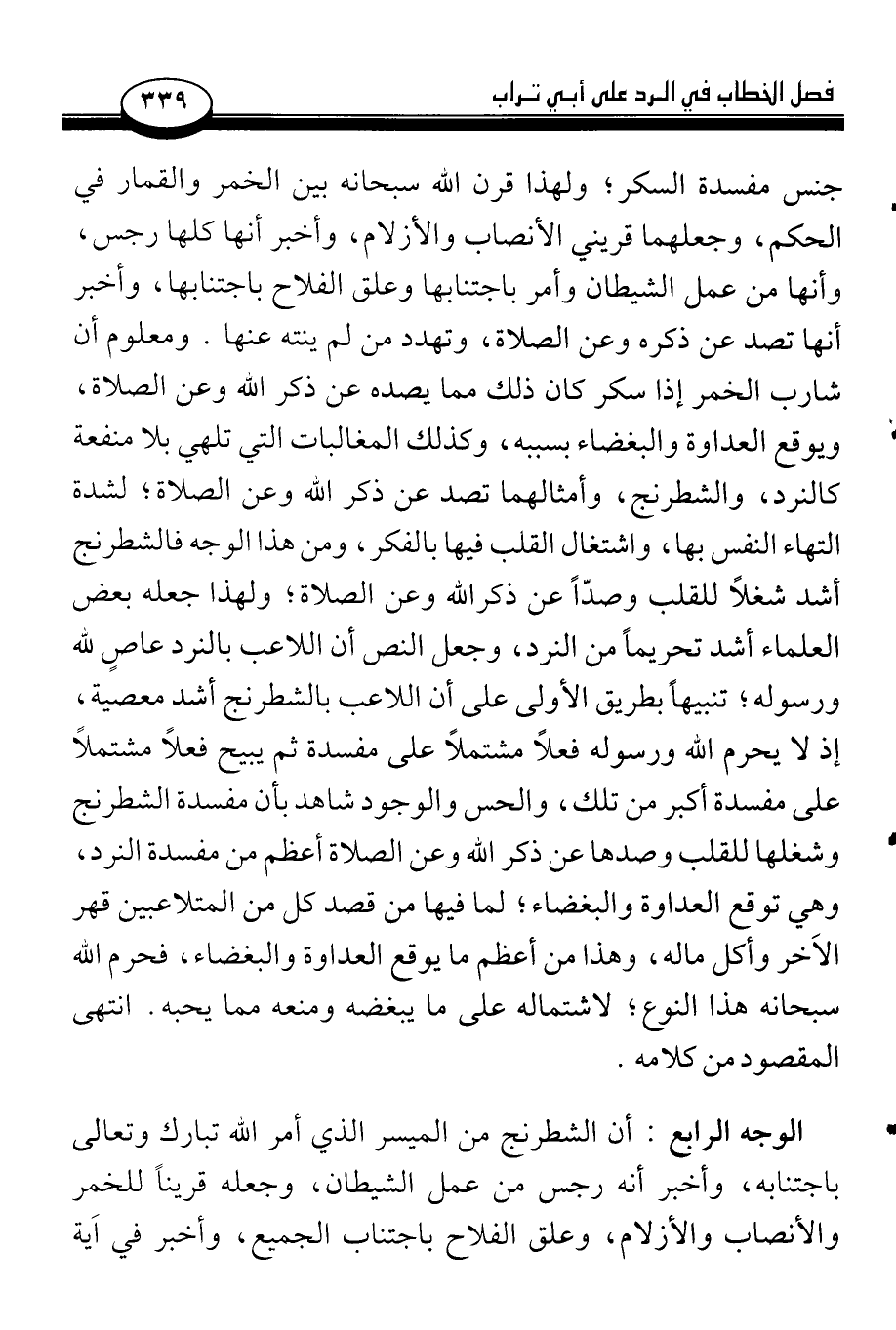 جنس مفسد السكر؛ ولهذا قرن الله سبحانه بين الخمر والقمار في الحكم، وجعلهما قريني الأنصاب والأزلام، وأخبر أنها كلها رجس، وأنها من عمل الشيطان وأمر باجتنابها وعلق الفلاح باجتنابها، وأخبر أنها تصد عن ذكره وعن الصلاة، وتهدد من لم ينته عنها. ومعلوم أن شارب الخمر إذا سكر كان ذلك مما يصده عن ذكر الله وعن الصلاة، ويوقع العداوة والبغضاء بسببه، وكذلك المغالبات التي تلهي بلا منفعة كالنرد، والشطرنج، وأمثالهما تصد عن ذكر الله وعن الصلاة؛ لشدة التهاء النفس بها، واشتغال القلب فيها بالفكر، ومن هذا الوجه فالشطرنج أشد شغلاً للقلب وصدّاً عن ذكر الله وعن الصلاة؛ ولهذا جعله بعض العلماء أشد تحريماً من النرد، وجعل النص أن اللاعب بالنرد عاصٍ لله ورسوله؛ تنبيهاً بطريق الأولى على أن اللاعب بالشطرنج أشد معصية، إذ لا يحرم الله ورسوله فعلاً مشتملاً على مفسدة ثم يبيح فعلاً مشتملاً عل مفسدة أكبر من تلك، والحس والوجود شاهد بأن مفسدة الشطرنج وشغلها للقلب وصدها عن ذكر الله وعن الصلاة أعظم من مفسدة النرد، وهي توقع العداوة والبغضاء؛ لما فيها من قصد كل من المتلاعبين قهر الآخر وأكل ماله، وهذا من أعظم ما يوقع العداوة والبغضاء، فحرم الله سبحانه هذا النوع؛ لاشتماله على ما يبغضه ومنعه مما يحبه. انتهى المقصود من كلامه.
