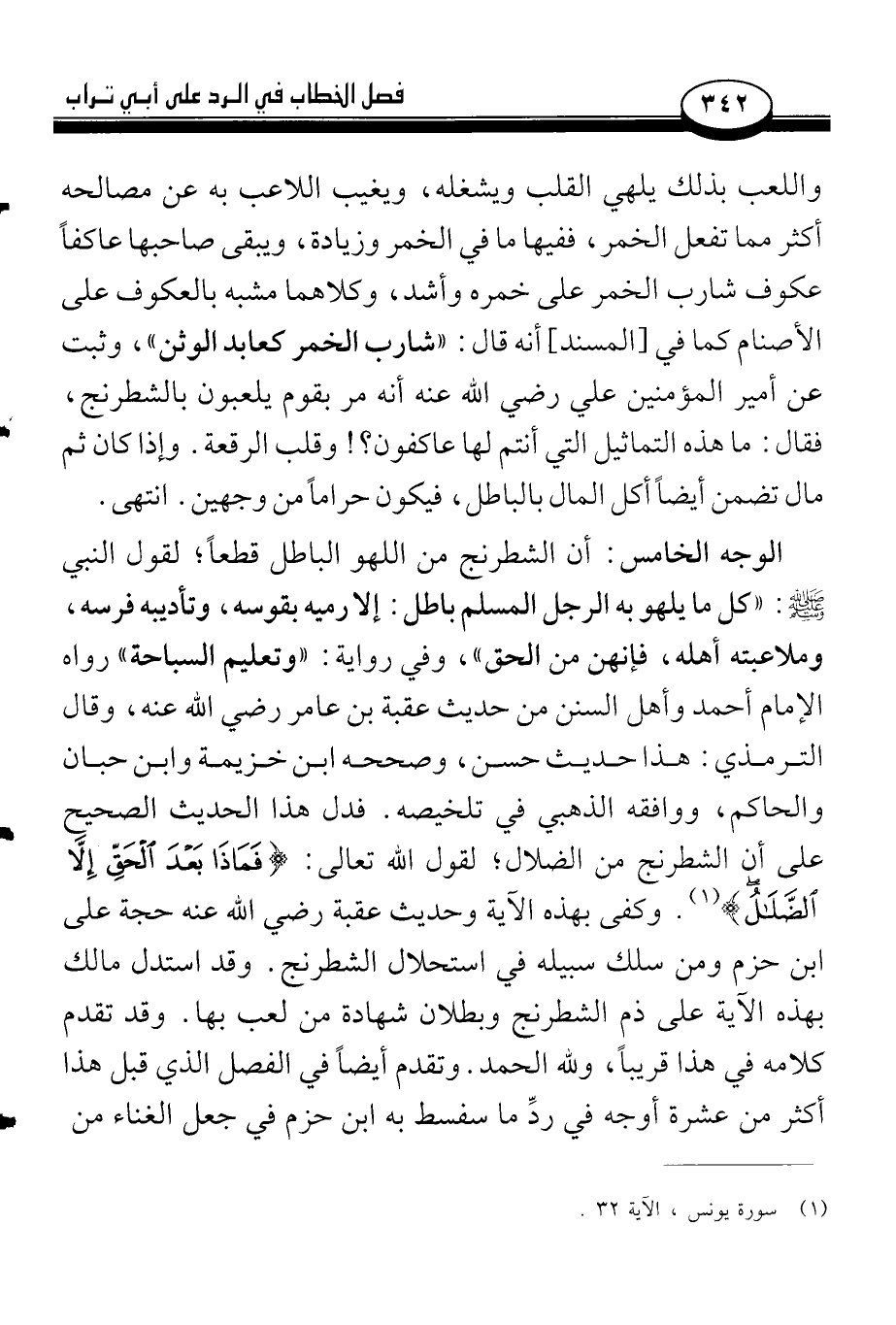 الوجه الخامس: أن الشطرنج من اللهو الباطل قطعاً؛ لقول النبي صلى الله عليه وسلم: «كل ما يلهو به الرجل المسلم باطل: إلا رميه بقوسه، وتأديبه فرسه، وملاعبته أهله، فإنهن من الحق»، وفي رواية: «وتعليم السباحة» رواه الإمام أحمد وأهل السنن من حديث عقبة بن عامر رضي الله عنه، وقال الترمذي: هذا حديث حسن، وصححه ابن خزيمة وابن حبان والحاكم، ووافقه الذهبي في تلخيصه. فدل هذا الحديث الصحيح على أن الشطرنج من الضلال؛ لقول الله تعالى: {فَمَاذَا بَعْدَ الْحَقِّ إِلاَّ الضَّلاَلُ} (¬1). وكفى بهذه الآية وحديث عقبة رضي الله عنه حجة على ابن حزم ومن سلك سبيله في استحلال الشطرنج. وقد استدل مالك بهذه الآية على ذم الشطرنج وبطلان شهادة من لعب بها. وقد تقدم كلامه في هذا قريباً، ولله الحمد. وتقدم أيضاً في الفصل الذي قبل هذا أكثر من عشرة أوجه في ردِّ ما سفسط به ابن حزم في جعل الغناء من