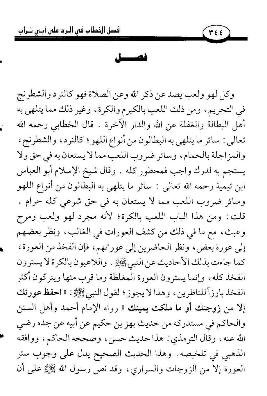 كل لهو ولعب يصد عن ذكر الله وعن الصلاة فهو كالنرد والشطرنج في التحريم، ومن ذلك اللعب بالكيرم والكرة، وغير ذلك مما يتلهى به أهل البطالة والغفلة عن الله والدار الآخرة. قال الخطابي رحمه الله تعالى: سائر ما يتلهى به البطالون من أنواع اللهو؛ كالنرد، والشطرنج، والمزاجلة بالحمام، وسائر ضروب اللعب مما لا يستعان به في حق ولا يستجم به لدرك واجب فمحظور كله. وقال شيخ الإسلام أبو العباس ابن تيمية رحمه الله تعالى: سائر ما يتلهى به الباطلون من أنواع اللهو وسائر ضروب اللعب مما لا يستعان به في حق شرعي كله حرام. قلت: ومن هذا الباب اللعب بالكرة؛ لأنه مجرد لهو ولعب ومرح وعبث، مع ما في ذلك من كشف العورات في الغالب، ونظر بعضهم إلى عورة بعض، ونظر الحاضرين إلى عوراتهم، فإن الفخذ من العورة، كما جاءت بذلك الأحاديث عن النبي صلى الله عليه وسلم. واللاعبون بالكرة لا يسترون الفخذ كله، وإنما يسترون العورة المغلظة وما قرب منها ويتركون أكثر الفخذ بارزاً للناظرين، وهذا لا يجوز؛ لقول النبي صلى الله عليه وسلم: «احفظ عورتك إلا من زوجتك أو ما ملكت يمينك» رواه الإمام أحمد وأهل السنن والحاكم في مستدركه من حديث بهز بن حكيم عن أبيه عن جده رضي الله عنه، وقال الترمذي: هذا حديث حسن، وصححه الحاكم، ووافقه الذهبي في تلخيصه. وهذا الحديث صحيح يدل على وجوب ستر العورة إلا من الزوجات والسراري، وقد نص رسول الله صلى الله عليه وسلم على أن
