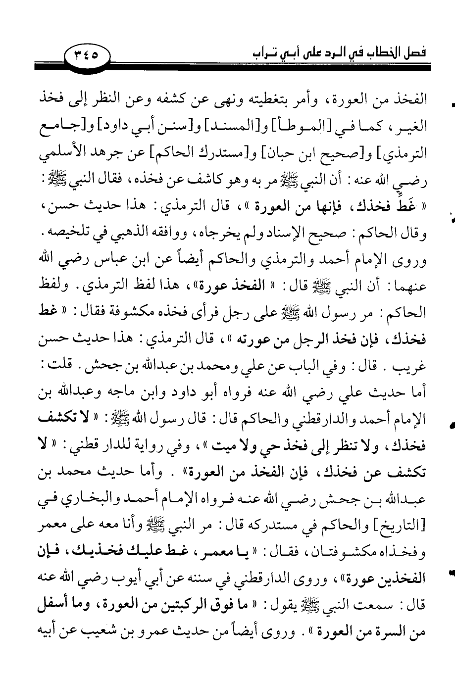 الفخذ من العورة، وأمر بتغطيته ونهى عن كشفه وعن النظر إلى فخذ الغير، كما في [الموطأ] و [المسند] و [سنن أبي داود] و [جامع الترمذي] و [صحيح ابن حبان] و [مستدرك الحاكم] عن جرهد الأسلمي رضي الله عنه: أن النبي صلى الله عليه وسلم مر به وهو كاشف عن فخذه، فقال النبي صلى الله عليه وسلم: «غَطِّ فخذك، فإنها من العورة»، قال الترمذي: هذ حديث حسن، وقال الحاكم: صحيح الإسناد ولم يخرجاه، ووافقه الذهبي في تلخيصه. وروى الإمام أحمد والترمذي والحاكم أيضاً عن ابن عباس رضي الله عنهما: أن النبي صلى الله عليه وسلم قال: «الفخذ عورة»، هذا لفظ الترمذي. ولفظ الحاكم: مر رسول الله صلى الله عليه وسلم على رجل فرأى فخذه مكشوفة فقال: «غط فخذك، فإن فخذ الرجل من عورته»، قال الترمذي: هذا حديث حسن غريب. قال: وفي الباب عن علي ومحمد بن عبد الله بن جحش. قلت: أما حديث علي رضي الله عنه فرواه أبو داود وابن ماجه وعبد الله بن الإمام أحمد والدارقطني والحاكم قال: قال رسول الله صلى الله عليه وسلم: «لا تكشف فخذك، ولا تنظر إلى فخذ حي ولا ميت»، وفي رواية للدار قطني: «لا تكشف عن فخذك، فإن الفخذ من العورة». وأما حديث محمد بن عبد الله بن جحش رضي الله عنه فرواه الإمام أحمد والبخاري في [التاريخ] والحاكم في مستدركه قال: مر النبي صلى الله عليه وسلم وأنا معه على معمر وفخذاه مكشوفتان، فقال: «يا معمر، غط عليك فخذيك، فإن الفخذي عورة»، وروى الدارقطني في سننه عن أبي أيوب رضي الله عنه قال: سمعت النبي صلى الله عليه وسلم يقول: «ما فوق الركبتين من العورة، وما أسفل من السرة من العورة». وروى أيضاً من حديث عمرو بن شعيب عن أبيه