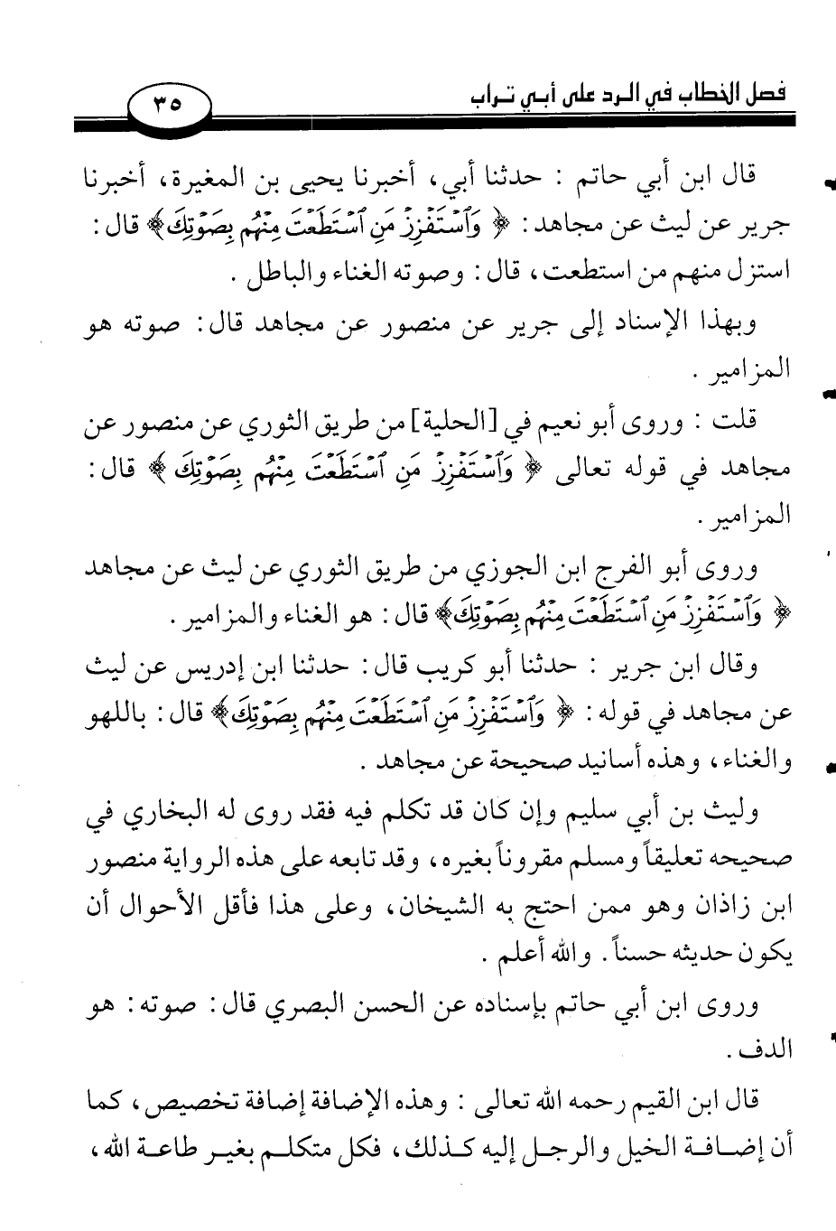 وروى أبو الفرج ابن الجوزي من طريق الثوري عن ليث عن مجاهد {وَاسْتَفْزِزْ مَنِ اسْتَطَعْتَ مِنْهُمْ بِصَوْتِكَ} قال: هو الغناء والمزامير.