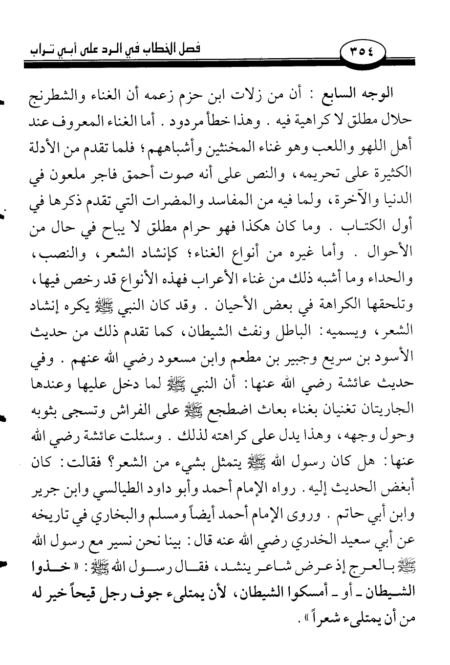 الوجه السابع: أن من زلات ابن حزم زعمه أن الغناء والشطرنج حلال مطلق لا كراهية فيه. وهذا خطأ مردود. أما الغناء المعروف عند أهل اللهو واللعب وهو غناء المخنثين وأشباههم؛ فلما تقدم من الأدلة الكثيرة على تحريمه، والنص على أنه صوت أحمق فاجر ملعون في الدنيا والآخرة، ولما فيه من المفاسد والمضرات التي تقدم ذكرها في أول الكتاب. وما كان هكذا فهو حرام مطلق لا يباح في حال من الأحوال. وأما غيره من أنواع الغناء؛ كإنشاد الشعر، والنصب، والحداء وما أشبه ذلك من غناء الأعراب فهذه الأنواع قد رخص فيها، وتلحقها الكراهة في بعض الأحيان. وقد كان النبي صلى الله عليه وسلم يكره إنشاد الشعر، ويسميه: الباطل ونفث الشيطان، كما تقدم ذلك من حديث الأسود بن سريع وجبير بن مطعم وابن مسعود رضي الله عنهم. وفي حديث عائشة رضي الله عنها: أن النبي صلى الله عليه وسلم لما دخل عليها وعندها الجاريتان تغنيان بغناء بعاث اضطجع صلى الله عليه وسلم على الفراش وتسجى بثوبه وحول وجهه، وهذا يدل على كراهته لذلك. وسئلت عائشة رضي الله عنها: هل كان رسول الله صلى الله عليه وسلم يتمثل بشيء من الشعر؟ فقالت: كان أبغض الحديث إليه. رواه الإمام أحمد وأبو داود الطيالسي وابن جرير وابن أبي حاتم. وروى الإمام أحمد أيضاً ومسلم والبخاري في تاريخه عن أبي سعيد الخدري رضي الله عنه قال: بينا نحن نسير مع رسول الله صلى الله عليه وسلم بالعرج إذ عرض شاعر ينشد، فقال رسول الله صلى الله عليه وسلم: «خذوا الشيطان - أو - أمسكوا الشيطان، لأن يمتلئ جوف رجل قيحاً خير له من أن يمتلئ شعراً».