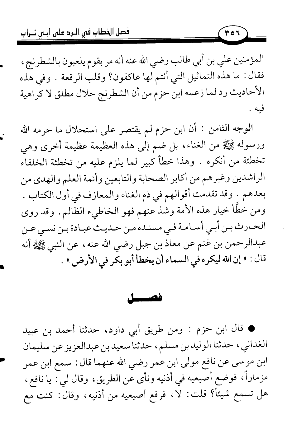 الوجه الثامن: أن ابن حزم لم يقتصر على استحلال ما حرمه الله ورسوله صلى الله عليه وسلم من الغناء، بل ضم إلى هذه العظيمة عظيمة أخرى وهي تخطئة من أنكره. وهذا خطأ كبير لما يلزم عليه من تخطئة الخلفاء الراشدين وغيرهم من أكابر الصحابة والتابعين وأئمة العلم والهدى من بعدهم. وقد تقدمت أقوالهم في ذم الغناء والمعازف في أول الكتاب. ومن خطَّأ خيار هذه الأمة وشذ عنهم فهو الخاطيء الظالم. وقد روى الحارث عبد الرحمن بن غنم عن معاذ بن جبل رضي الله عنه، عن النبي صلى الله عليه وسلم أنه قال: «إن الله ليكره في السماء أن يخطأ أبو بكر في الأرض».