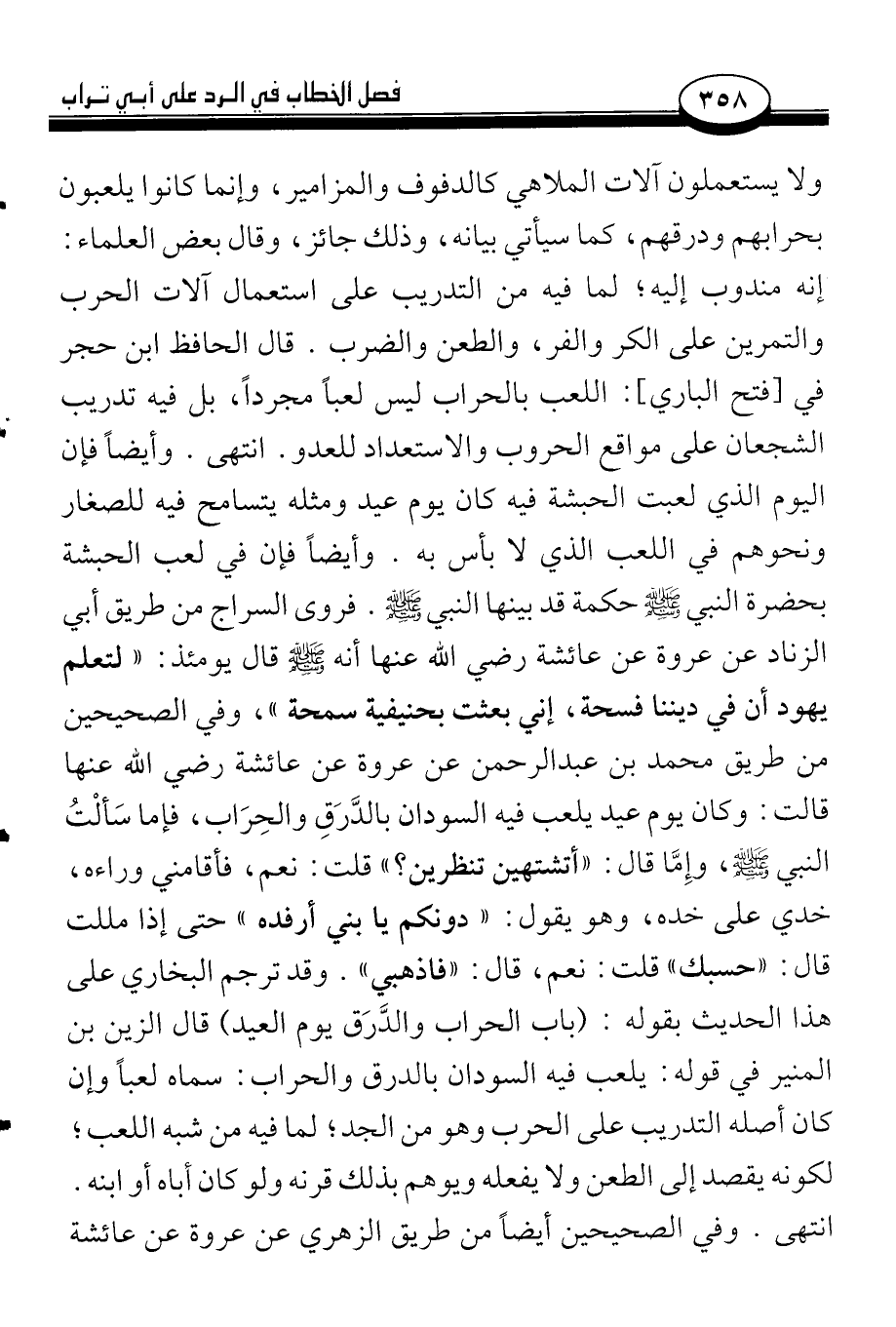 ولا يستعملون آلات الملاهي كالدفوف والمزامير، وإنما كانوا يلعبون بحرابهم ودرقهم، كما سيأتي بيانه، وذلك جائز، وقال بعض العلماء: إنه مندوب إليه؛ لما فيه من التدريب على استعمال آلات الحرب والتمرين على الكر والفر، والطعن والضرب. قال الحافظ ابن حجر في [فتح الباري]: اللعب بالحراب ليس لعباً مجرداً، بل فيه تدريب الشجعان على مواقع الحروب والاستعداد للعدو. انتهى. وأيضاً فإن اليوم الذي لعبت الحبشة فيه كان يوم عيد ومثله يتسامح فيه للصغار ونحوهم في اللعب الذي لا بأس به. وأيضاً فإن في لعب الحبشة بحضرة النبي صلى الله عليه وسلم حكمة قد بينها النبي صلى الله عليه وسلم. فروى السراج من طريق أبي الزناد عن عروة عن عائشة رضي الله عنها أنه صلى الله عليه وسلم قال يومئذ: «لتعلم يهود أن في ديننا فسحة، إني بعثت بحنيفية سمحة»، وفي الصحيحين من طريق محمد بن عبد الرحمن عن عروة عن عائشة رضي الله عنها قالت: وكان يوم عيد يلعب فيه السودان بالدَّرَقِ والحِرَاب، فإما سَألْتُ النبي صلى الله عليه وسلم، وإمَّا قال: «أتشتهين تنظرين؟» قلت: نعم، فأقامني وراءه، خدي على خده، وهو يقول: «دونكم يا بني أرفده» حتى إذا مللت قال: «حسبك» قلت: نعم، قال: «فاذهبي». وقد ترجم البخاري على هذا الحديث بقوله: (باب الحراب والدَّرَق يوم العيد) قال الزين بن المنير في قوله: يلعب فيه السودان بالدرق والحراب: سماه لعباً وإن كان أصله التدريب على الحرب وهو من الجد؛ لما فيه من شبه اللعب؛ لكونه يقصد إلى الطعن ولا يفعله ويوهم بذلك قرنه ولو كان أباه أو ابنه. انتهى. وفي الصحيحين أيضاً من طريق الزهري عن عروة عن عائشة