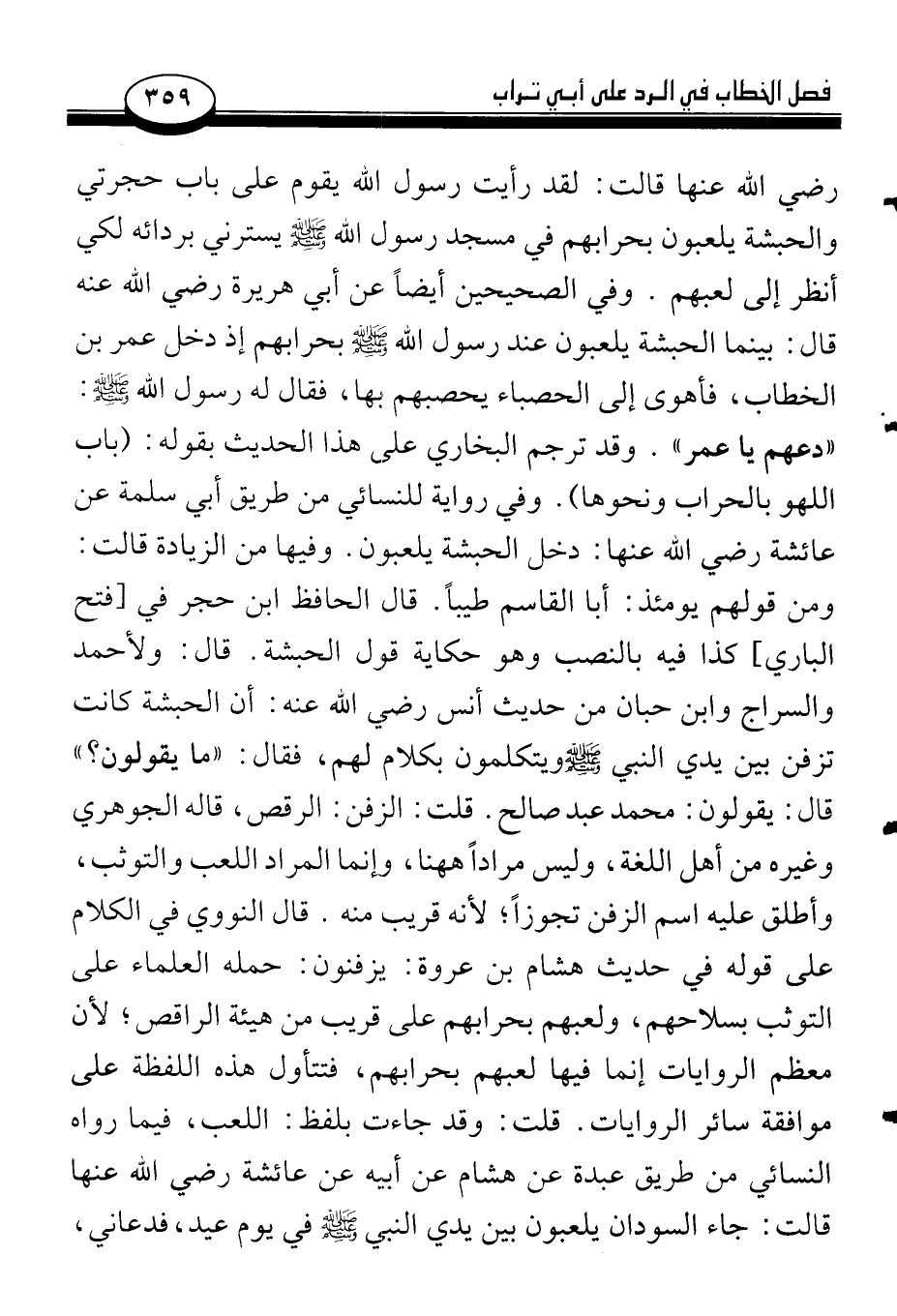 رضي الله عنها قالت: لقد رأيت رسول الله يقوم على باب حجرتي والحبشة يلعبون بحرابهم في مسجد رسول الله صلى الله عليه وسلم يسترني بردائه لكي أنظر إلى لعبهم. وفي الصحيحين أيضاً عن أبي هريرة رضي الله عنه قال: بينما الحبشة يلعبون عند رسول الله صلى الله عليه وسلم بحرابهم إذ دخل عمر بن الخطاب، فأهوى إلى الحصباء يحصبهم بها، فقال له رسول الله صلى الله عليه وسلم: «دعهم يا عمر». وقد ترجم البخاري على هذا الحديث بقوله: (باب اللهو بالحراب ونحوها). وفي رواية للنسائي من طريق أبي سلمة عن عائشة رضي الله عنها: دخل الحبشة يلعبون. وفيها من الزيادة قالت: ومن قولهم يومئذ: أبا القاسم طيباً. قال الحافظ ابن حجر في [فتح الباري] كذا فيه بالنصب وهو حكاية قول الحبشة. قال: ولأحمد والسراج وابن حبان من حديث أنس رضي الله عنه: أن الحبشة كانت تزفن بين يدي النبي صلى الله عليه وسلم ويتكلمون بكلام لهم، فقال: «ما يقولون؟» قال: يقولون: محمد عبد صالح. قلت: الزفن: الرقص، قاله الجوهري وغيره من أهل اللغة، وليس مراداً ههنا، وإنما المراد اللعب والتوثب، وأطلق عليه اسم الزفن تجوزاً؛ لأنه قريب منه. قال النووي في الكلام على قوله في حديث هشام بن عروة: يزفنون: حمله العلماء على التوثب بسلاحهم، ولعبهم بحرابهم على قريب من هيئة الراقص؛ لأن معظم الروايات إنما فيها لعبهم بحرابهم، فتتأول هذه اللفظة على موافقة سائر الروايات. قلت: وقد جاءت بلفظ: اللعب، فيما رواه النسائي من طريق عبدة عن هشام عن أبيه عن عائشة رضي الله عنها قالت: جاء السودان يلعبون بين يدي النبي صلى الله عليه وسلم في يوم عيد، فدعاني،