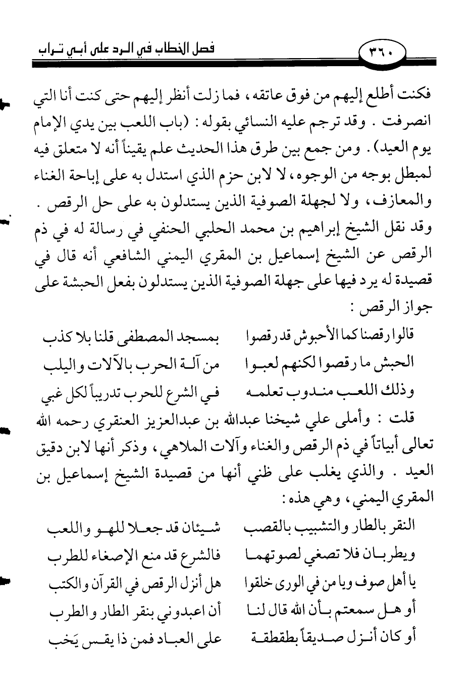 فكنت أطلع عليهم من فوق عاتقه، فما زلت أنظر إليهم حتى كنت أنا التي انصرفت. وقد ترجم عليه النسائي بقوله: (باب اللعب بين يدي الإمام يوم العيد). ومن جمع بين طرق هذا الحديث علم يقيناً أنه لا متعلق فيه لمبطل بوجه من الوجوه، لا لابن حزم الذي استدل به على إباحة الغناء والمعازف، ولا لجهلة الصوفية الذين يستدلون به على حل الرقص. وقد نقل الشيخ إبراهيم بن محمد الحلبي الحنفي في رسالة له في ذم الرقص عن الشيخ إسماعيل بن المقري اليمني الشافعي أنه قال في قصيدة له يرد فيها على جهلة الصوفية الذين يستدلون بفعل الحبشة على جواز الرقص:
