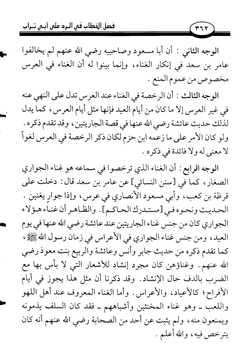 الوجه الرابع: أن الغناء الذي ترخصوا في سماعه هو غناء الجواري الصغار، كما في [سنن النسائي] عن عامر بن سعد قال: دخلت على قرظة بن كعب، وأبي مسعود الأنصاري في عرس، وإذا جوارٍ يغنين. الحديث ونحوه في [مستدرك الحاكم]. والظاهر أن غناء هؤلاء الجواري كان من جنس غناء الجاريتين عند عائشة رضي الله عنها في يوم العيد، ومن جنس غناء الجواري في الأعراس في زمان رسول الله صلى الله عليه وسلم، كما تقدم ذكره من حديث جابر وأنس وعائشة والربيع بنت معوذ رضي الله عنهم. وغناؤهن كان مجرد إنشاد للأشعار التي لا بأس بها مع الضرب بالدف حال الإنشاد. قد ذكرنا أن مثل هذا يجوز في أيام الأفراح؛ كالأعياد، والأعراس. وأما الغناء المعروف عند أهل اللهو واللعب - وهو غناء المخنثين وأشباههم - فقد كان السلف يذمونه ويمنعون منه، ولم يثبت عن أحد من الصحابة رضي الله عنهم أنه كان يترخص فيه، والله أعلم.