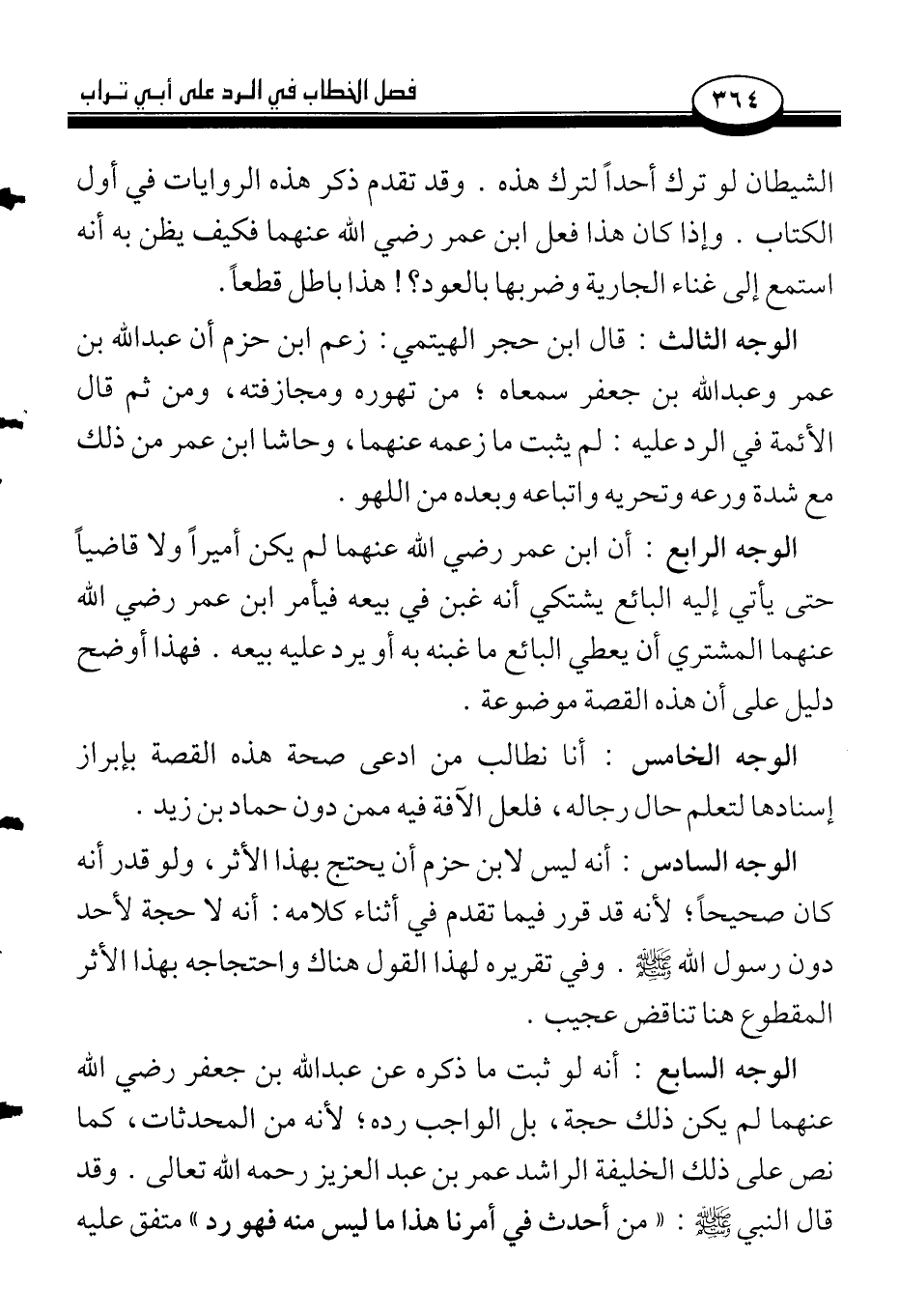 الوجه السابع: أنه لو ثبت ما ذكره عن عبد الله بن جعفر رضي الله عنهما لم يكن ذلك حجة، بل الواجب رده؛ لأنه من المحدثات، كما نص على ذلك الخليفة الراشد عمر بن عبد العزيز رحمه الله تعالى. وقد قال النبي صلى الله عليه وسلم: «من أحدث في أمرنا هذا ما ليس منه فهو رد» متفق عليه