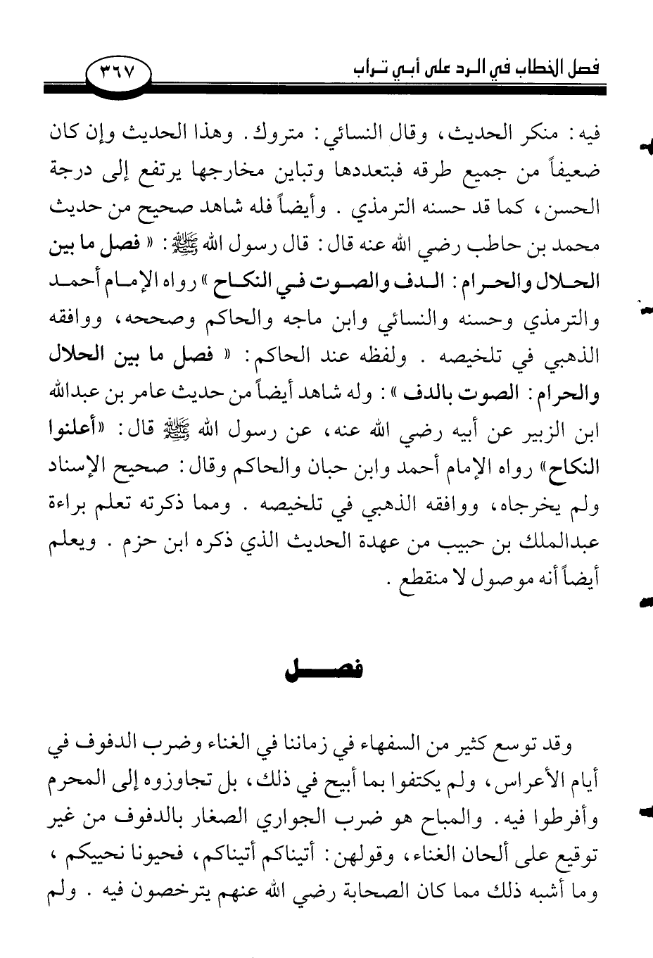 فيه: منكر الحديث، وقال النسائي: متروك. وهذا الحديث وإن كان ضعيفاً من جميع طرقه فبتعددها وتباين مخارجها يرتفع إلى درجة الحسن، كما قد حسنه الترمذي. وأيضاً فله شاهد صحيح من حديث محمد بن حاطب رضي الله عنه قال: قال رسول الله صلى الله عليه وسلم: «فصل ما بين الحلال والحرام: الدف والصوت في النكاح» رواه الإمام أحمد والترمذي وحسنه والنسائي وابن ماجه والحاكم وصححه، ووافقه الذهبي في تلخيصه. ولفظه عند الحاكم: «فصل ما بين الحلال والحرام: الصوت بالدف»: وله شاهد أيضاً من حديث عامر بن عبد الله ابن الزبير عن أبيه رضي الله عنه، عن رسول الله صلى الله عليه وسلم قال: «أعلنوا النكاح» رواه الإمام أحمد وابن حبان والحاكم وقال: صحيح الإسناد ولم يخرجاه، ووافقه الذهبي في تلخيصه. ومما ذكرته تعلم براءة عبد الملك بن حبيب من عهدة الحديث الذي ذكره ابن حزم. ويعلم أيضاً أنه موصول لا منقطع.