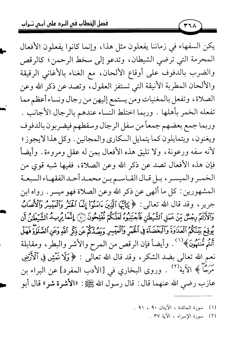 يكن السفهاء في زماننا يفعلون مثل هذا، وإنما كانوا يفعلون الأفعال المحرمة التي ترضي الشيطان، وتدعو إلى سخط الرحمن؛ كالرقص والضرب بالدفوف على أوقاع الألحان، مع الغناء بالأغاني الرقيقة والألحان المطربة الأنيقة التي تستفز العقول، وتصد عن ذكر الله وعن الصلاة، وتفعل بالمغنيات ومن يستمع إليهن من رجال ونساء أعظم مما تفعله الخمر بأهلها. وربما اختلط النساء عندهم بالرجال الأجانب. وربما جمع بعضهم جمعاً من سفل الرجال وسقطهم فيضربون بالدفوف ويغنون، ويتمايلون كما يتمايل السكارى والمجانين. وكل هذا لا يجوز؛ لأنه سفه ورعونة، ولا تليق هذه الأفعال بمن له عقل ومروءة. وأيضاً فإن هذه الأفعال تصد عن ذكر الله وعن الصلاة، ففيها شبه قوي من الخمر والميسر، بل قال القاسم بن محمد أحد الفقهاء السبعة المشهورين: كل ما ألهى عن ذكر الله وعن الصلاة فهو ميسر. رواه ابن جرير، وقد قال الله تعالى: {يَا أَيُّهَا الَّذِينَ آمَنُوا إِنَّمَا الْخَمْرُ وَالْمَيْسِرُ وَالأَنصَابُ وَالأَزْلاَمُ رِجْسٌ مِّنْ عَمَلِ الشَّيْطَانِ فَاجْتَنِبُوهُ لَعَلَّكُمْ تُفْلِحُونَ (90) إِنَّمَا يُرِيدُ الشَّيْطَانُ أَن يُوقِعَ بَيْنَكُمُ الْعَدَاوَةَ وَالْبَغْضَاء فِي الْخَمْرِ وَالْمَيْسِرِ وَيَصُدَّكُمْ عَن ذِكْرِ اللّهِ وَعَنِ الصَّلاَةِ فَهَلْ أَنتُم مُّنتَهُونَ} (¬1). وأيضاً فإن الرقص من المرح والأشر والبطر، ومقابلة نعم الله تعالى بضد الشكر، وقد قال الله تعالى: {وَلاَ تَمْشِ فِي الأَرْضِ مَرَحاً} الآية (¬2). وروى البخاري في [الأدب المفرد] عن البراء بن عازب رضي الله عنهما قال: قال رسول الله صلى الله عليه وسلم: «الأشرة شر» قال أبو