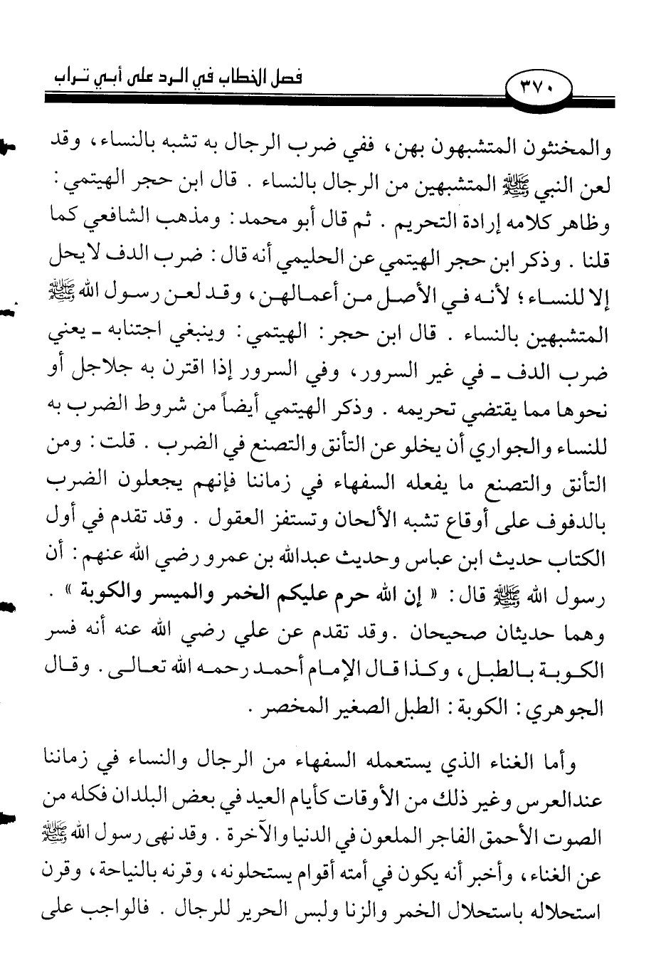 والمخنثون المتشبهون بهن، ففي ضرب الرجال به تشبه بالنساء، وقد لعن النبي صلى الله عليه وسلم المتشبهين من الرجال بالنساء. قال ابن حجر الهيتمي: وظاهر كلامه إرادة التحريم. ثم قال أبو محمد: ومذهب الشافعي كما قلنا. وذكر ابن حجر الهيتمي عن الحليمي أنه قال: ضرب الدف لا يحل إلا للنساء؛ لأنه في الأصل من أعمالهن، وقد لعن رسول الله صلى الله عليه وسلم المتشبهين بالنساء. قال ابن حجر: الهيتمي: وينبغي اجتنابه - يعني ضرب الدف - في غير السرور، وفي السرور إذا اقترن به جلاجل أو نحوها مما يقتضي تحريمه. وذكر الهيتمي أيضاً من شروط الضرب به للنساء والجواري أن يخلو عن التأنق والتصنع في الضرب. قلت: ومن التأنق والتصنع ما يفعله السفهاء في زماننا فإنهم يجعلون الضرب بالدفوف على أوقاع تشبه الألحان وتستفز العقول. وقد تقدم في أول الكتاب حديث ابن عباس وحديث عبد الله بن عمرو رضي الله عنهم: أن رسول الله صلى الله عليه وسلم قال: «إن الله حرم عليكم الخمر والميسر والكوبة». وهما حديثان صحيحان. وقد تقدم عن علي رضي الله عنه أنه فسر الكوبة بالطبل، وكذا قال الإمام أحمد رحمه الله تعالى. وقال الجوهري: الكوبة: الطبل الصغير المخصر.