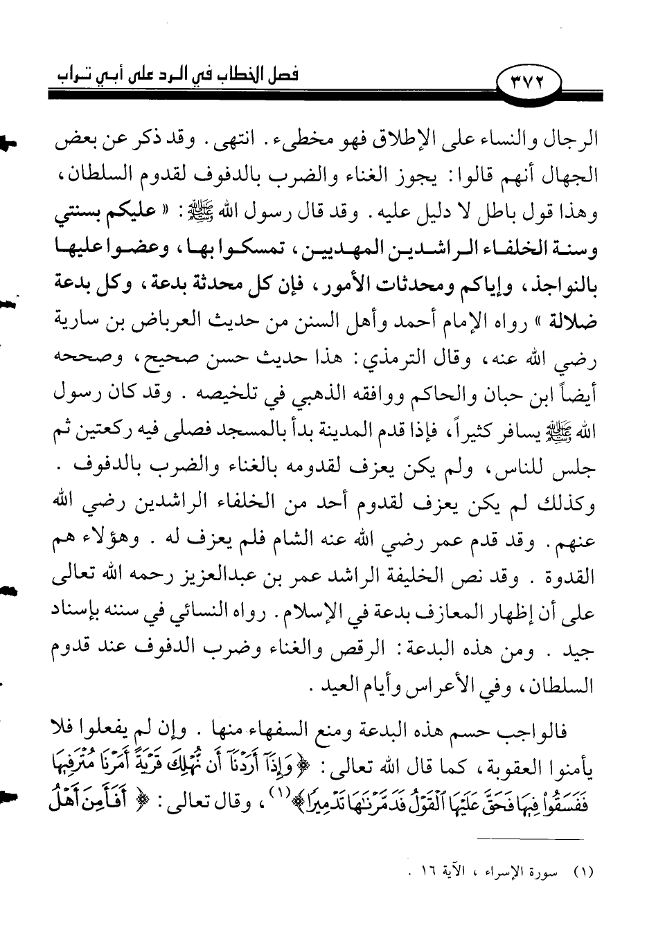 الرجال والنساء على الإطلاق فهو مخطئ. انتهى. وقد ذكر عن بعض الجهال أنهم قالوا: يجوز الغناء والضرب بالدفوف لقدوم السلطان، وهذا قول باطل لا دليل عليه. وقد قال رسول الله صلى الله عليه وسلم: «عليكم بسنتي وسنة الخلفاء الراشدين المهديين، تمسكوا بها، وعضوا عليها بالنواجذ، وإياكم ومحدثات الأمور، فإن كل محدثة بدعة، وكل بدعة ضلالة» رواه الإمام أحمد وأهل السنن من حديث العرباض بن سارية رضي الله عنه، وقال الترمذي: هذا حديث حسن صحيح، وصححه أيضاً ابن حبان والحاكم ووافقه الذهبي في تلخيصه. وقد كان رسول الله صلى الله عليه وسلم يسافر كثيراً، فإذا قدم المدينة بدأ بالمسجد فصلى فيه ركعتين ثم جلس للناس، ولم يكن يعزف لقدومه بالغناء والضرب بالدفوف. وكذلك لم يكن يعزف لقدوم أحد من الخلفاء الراشدين رضي الله عنهم. وقد قدم عمر رضي الله عنه الشام فلم يعزف له. وهؤلاء هم القدوة. وقد نص الخليفة الراشد عمر بن عبد العزيز رحمه الله تعالى على أن إظهار المعازف بدعة في الإسلام. رواه النسائي في سننه بإسناد جيد. ومن هذه البدعة: الرقص والغناء وضرب الدفوف عند قدوم السلطان، وفي الأعراس وأيام العيد.