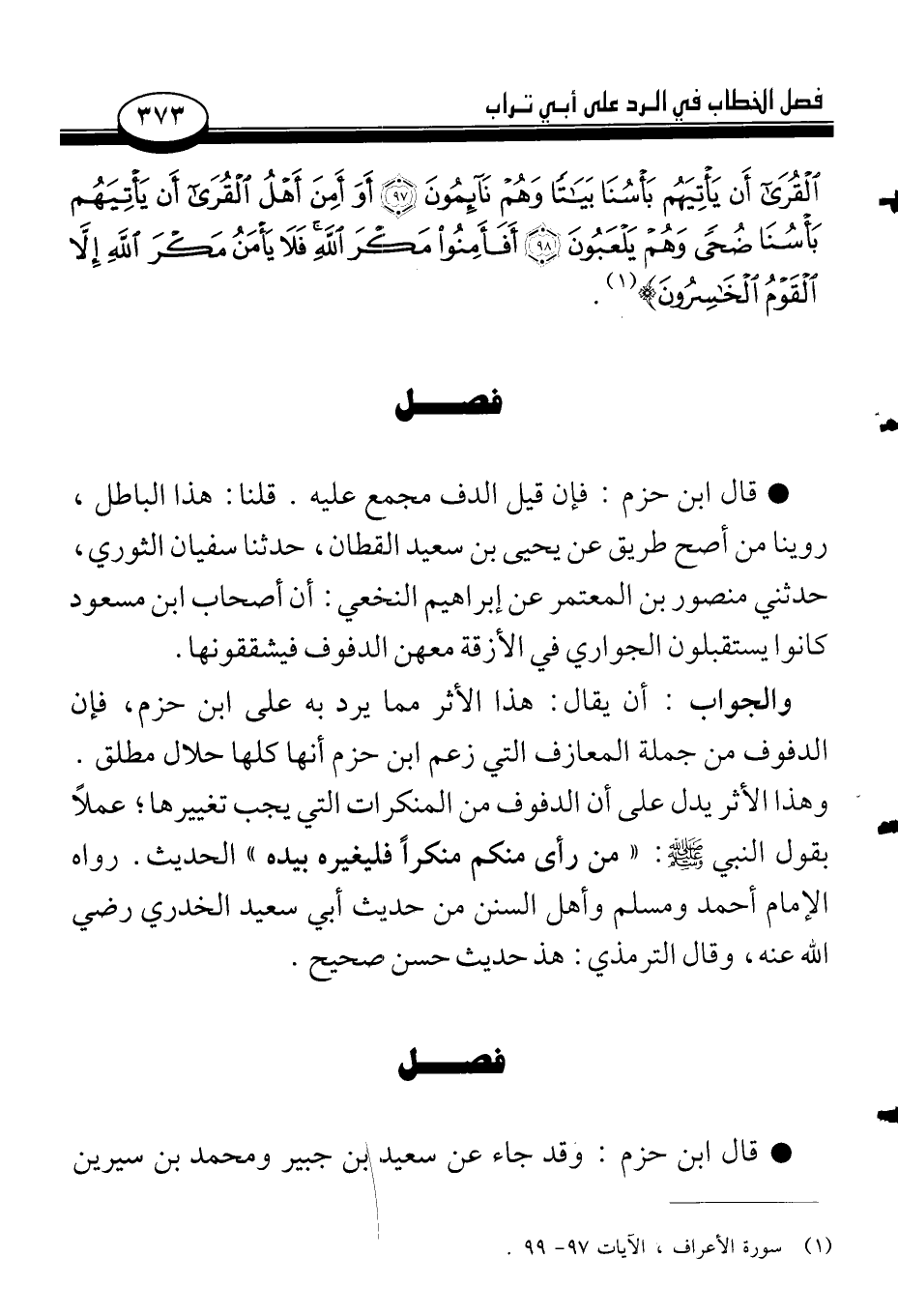 والجواب: أن يقال: هذا الأثر مما يرد به على ابن حزم، فإن الدفوف من جملة المعازف التي زعم ابن حزم أنها كلها حلال مطلق. وهذا الأثر يدل على أن الدفوف من المنكرات التي يجب تغييرها؛ عملاً بقول النبي صلى الله عليه وسلم: «من رأى منكم منكراً فليغيره بيده» الحديث. رواه الإمام أحمد ومسلم وأهل السنن من حديث أبي سعيد الخدري رضي الله عنه. وقال الترمذي: هذ حديث حسن صحيح.