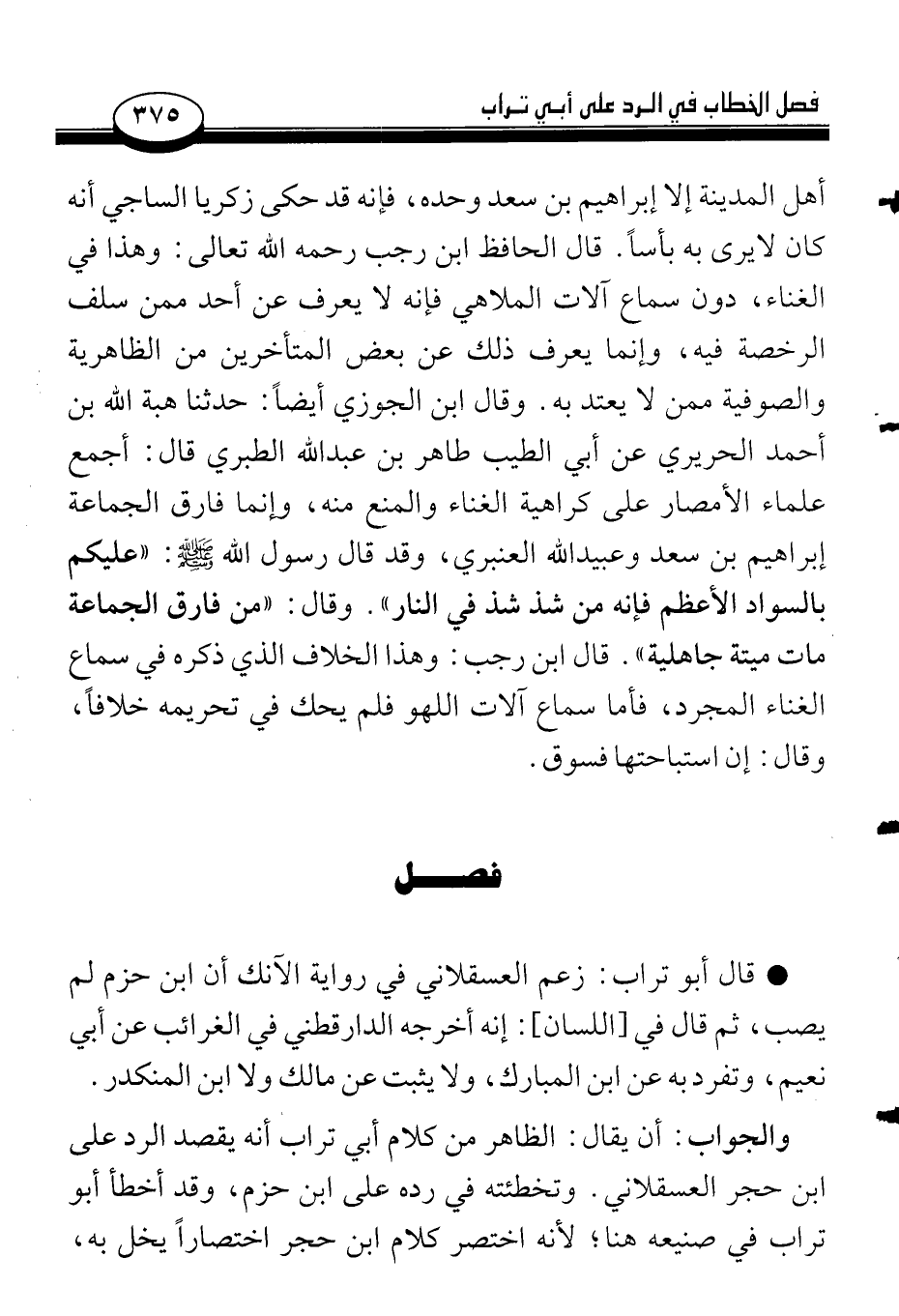 أهل المدينة إلا إبراهيم بن سعد وحده، فإنه قد حكى زكريا الساجي أنه كان لا يرى به بأساً. قال الحافظ ابن رجب رحمه الله تعالى: وهذا في الغناء، دون سماع آلات الملاهي فإنه لا يعرف عن أحد ممن سلف الرخصة فيه، وإنما يعرف ذلك عن بعض المتأخرين من الظاهرية والصوفية ممن لا يعتد به. وقال ابن الجوزي أيضاً: حدثنا هبة الله بن أحمد الحريري عن أبي الطيب طاهر بن عبد الله الطبري قال: أجمع علماء الأمصار على كراهية الغناء والمنع منه، وإنما فارق الجماعة إبراهيم بن سعد وعبيد الله العنبري، وقد قال رسول الله صلى الله عليه وسلم: «عليكم بالسواد الأعظم فإنه من شذ شذ في النار». وقال: «من فارق الجماعة مات ميتة جاهلية». قال ابن رجب: وهذه الخلاف الذي ذكره في سماع الغناء المجرد، فأما سماع آلات اللهو فلم يحك في تحريمه خلافاً، وقال: إن استباحتها فسوق.