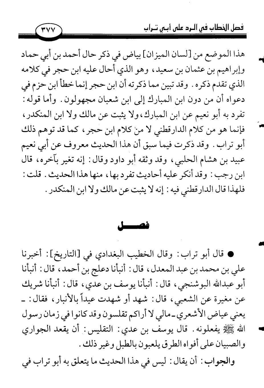 هذا الموضع من [لسان الميزان] بياض في ذكر حال أحمد بن أبي حماد وإبراهيم بن عثمان بن سعيد، وهو الذي أحال عليه ابن حجر في كلامه الذي تقدم ذكره. وقد تبين مما ذكرته أن ابن حجر إنما أخطأ ابن حزم في دعواه أن من دون ابن المبارك إلى ابن شعبان مجهولون. وأما قوله: تفرد به أبو نعيم عن ابن المبارك، ولا يثبت عن مالك ولا ابن المنكدر، فإنما هو من كلام الدارقطني لا من كلام ابن حجر، كما قد توهم ذلك أبو تراب. وقد ذكرت فيما سبق أن هذا الحديث معروف عن أبي نعيم عبيد بن هشام الحلبي، وقد وثقه أبو داود وقال: إنه تغير بآخره، قال ابن رجب: وقد أنكر عليه أحاديث تفرد بها، منها هذا الحديث. قلت: فلهذا قال الدارقطني فيه: إنه لا يثبت عن مالك ولا ابن المنكدر.