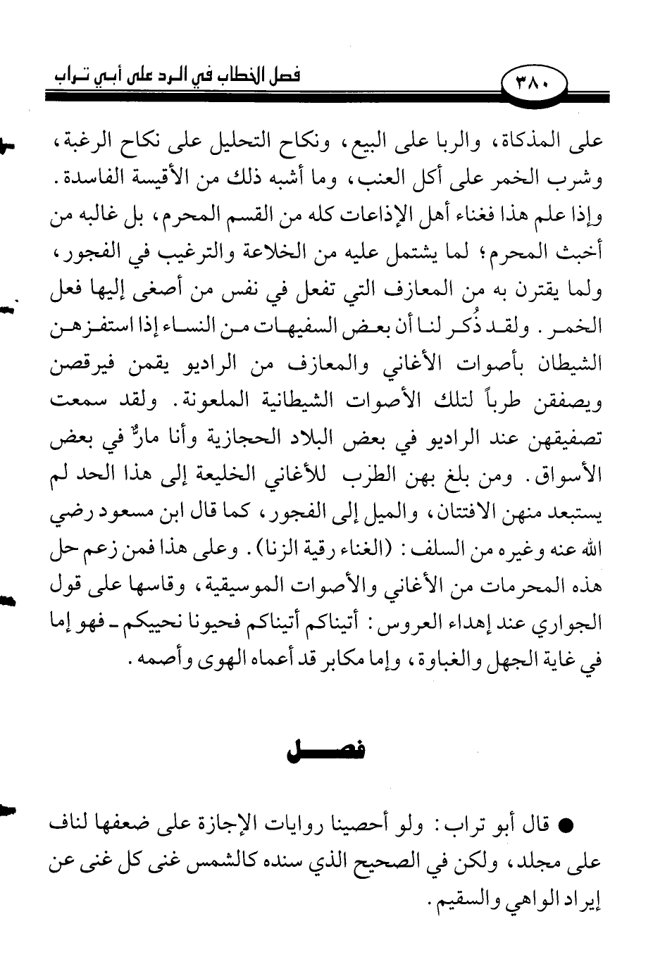 على المذكاة، والربا على البيع، ونكاح التحليل على نكاح الرغبة، وشرب الخمر على أكل العنب، وما أشبه ذلك من الأقيسة الفاسدة. وإذا علم هذا فغناء أهل الإذاعات كله في القسم المحرم، بل غالبه من أخبث المحرم؛ لما يشتمل عليه من الخلاعة والترغيب في الفجور، ولما يقترن به من المعازف التي تفعل في نفس من أصغى إليها فعل الخمر. ولقد ذُكر لنا أن بعض السفيهات من النساء إذا استفزهن الشيطان بأصوات الأغاني والمعازف من الراديو يقمن فيرقصن ويصفقن طرباً لتلك الأصوات الشيطانية الملعونة. ولقد سمعت تصفيقهن عند الراديو في بعض البلاد الحجازية وأنا مارٌّ في بعض الأسواق. ومن بلغ بهن الطرب للأغاني والأصوات الموسيقية وقاسها على قول الجواري عند إهداء العروس: أتيناكم أتيناكم فحيونا نحييكم - فهو إما في غاية الجهل والغباوة، وإما مكابر قد أعماه الهوى وأصمه.
