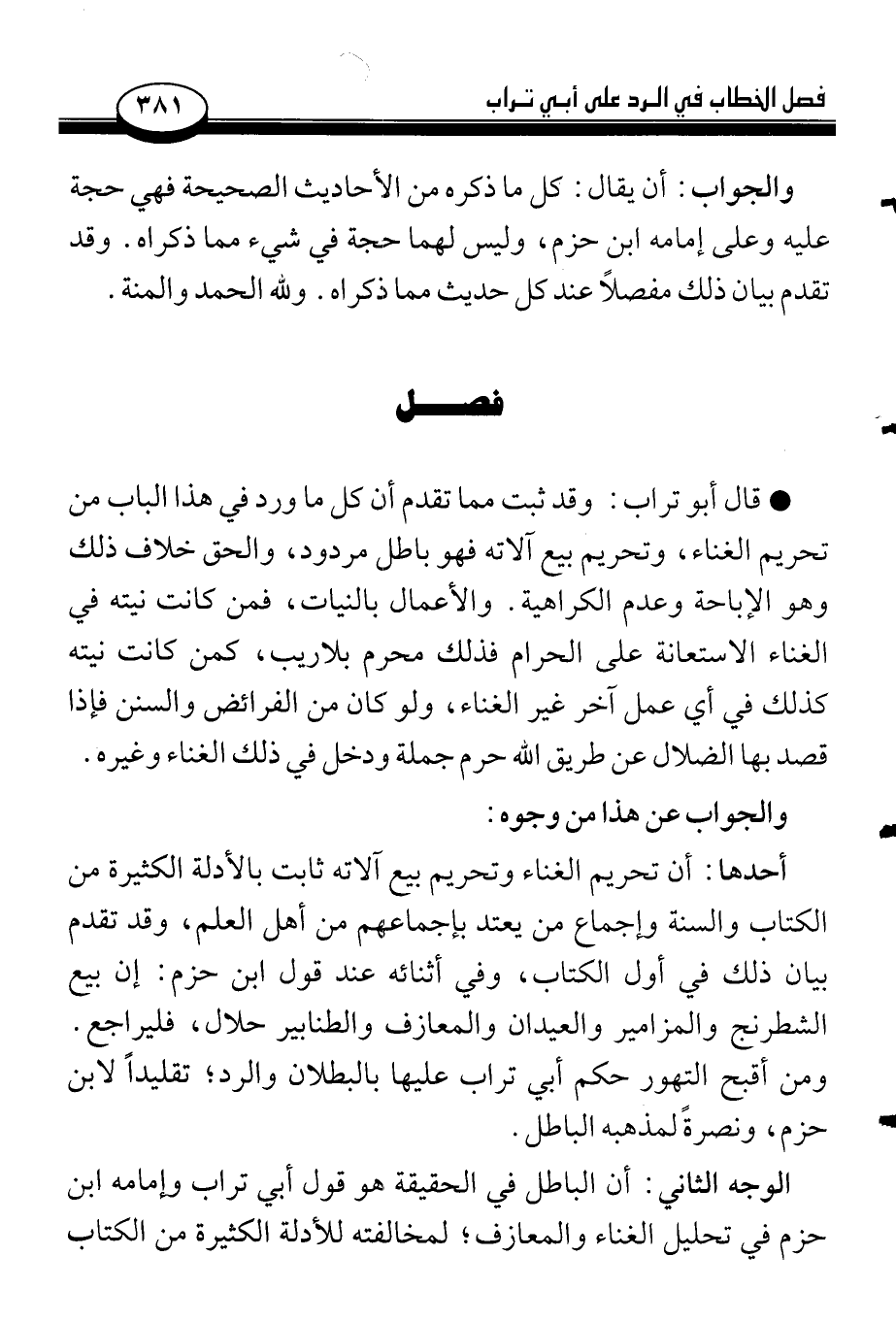 الوجه الثاني: أن الباطل في الحقيقة هو قول أبي تراب وإمامه ابن حزم في تحليل الغناء والمعازف؛ لمخالفته للأدلة الكثيرة من الكتاب
