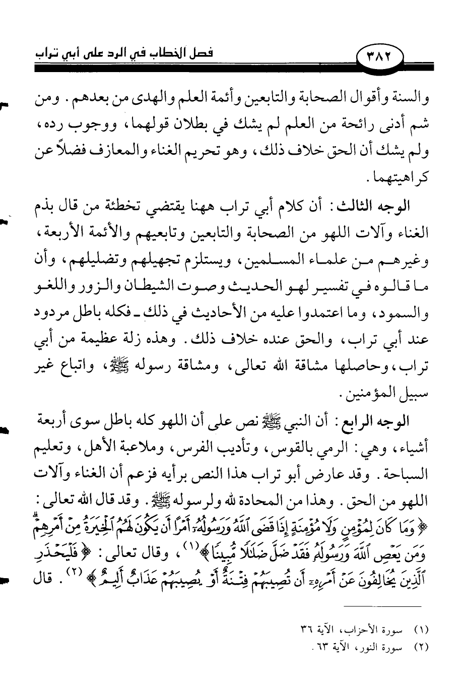 الوجه الثالث: أن كلام أبي تراب ههنا يقتضي تخطئة من قال بذم الغناء وآلات اللهو من الصحابة والتابعين وتابعيهم والأئمة الأربعة، وغيرهم من علماء المسلمين، ويستلزم تجهيلهم وتضليلهم، وأن ما قالوه في تفسير لهو الحديث وصوت الشيطان والزور واللغو والسمود، وما اعتمدوا عليه من الأحاديث في ذلك - فكله باطل مردود عند أبي تراب، والحق عنده خلاف ذلك. وهذه زلة عظيمة من أبي تراب، وحاصلها مشاقة الله تعالى، ومشاقة رسوله صلى الله عليه وسلم، واتباع غير سبيل المؤمنين.