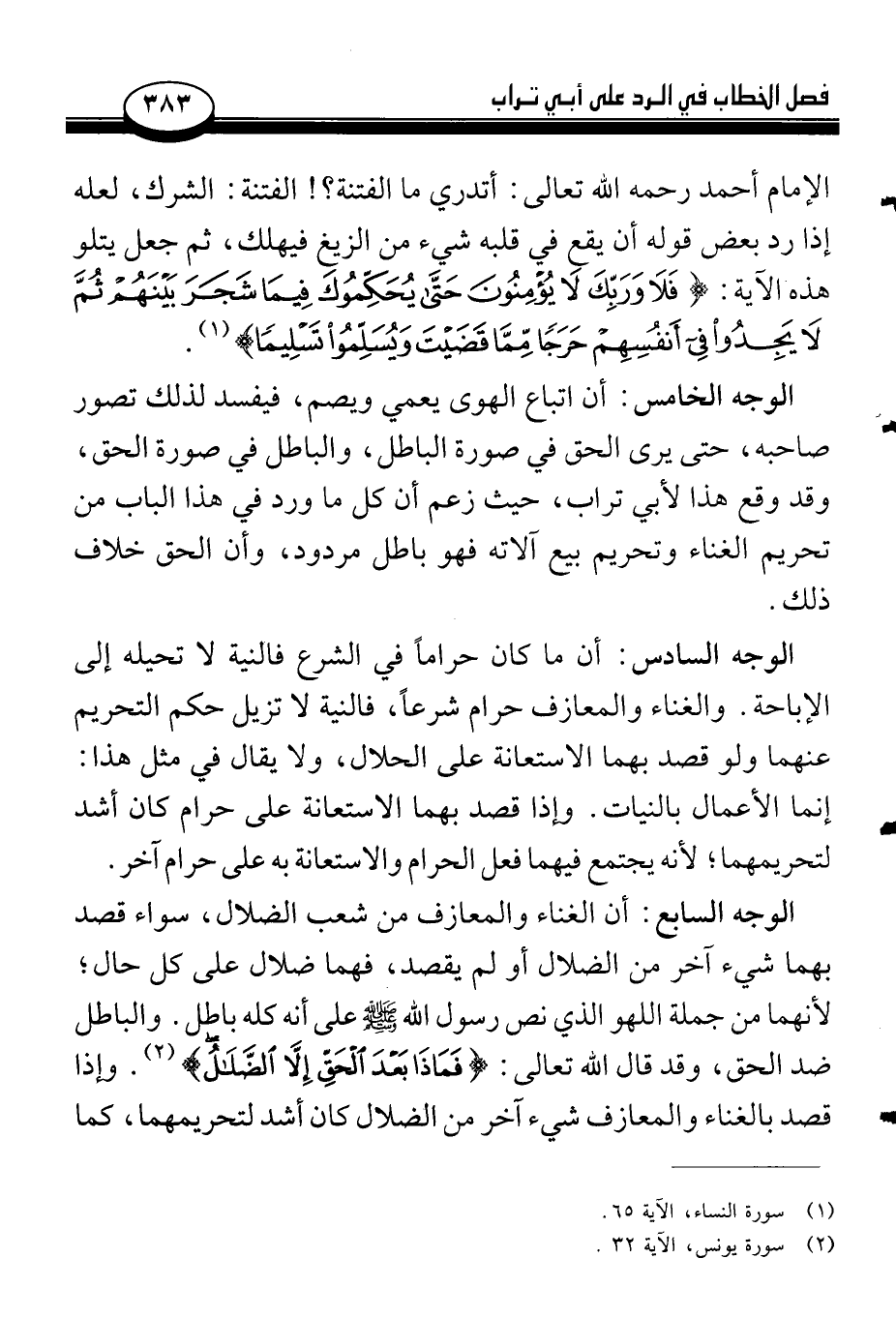 الوجه الخامس: أن اتباع الهوى يعمي ويصم، فيفسد لذلك تصور صاحبه، حتى يرى الحق في صورة الباطل، والباطل في صورة الحق، وقد وقع هذا لأبي تراب، حيث زعم أن كل ما ورد في هذا الباب من تحريم الغناء وتحريم بيع آلاته فهو باطل مردود، وأن الحق خلاف ذلك.