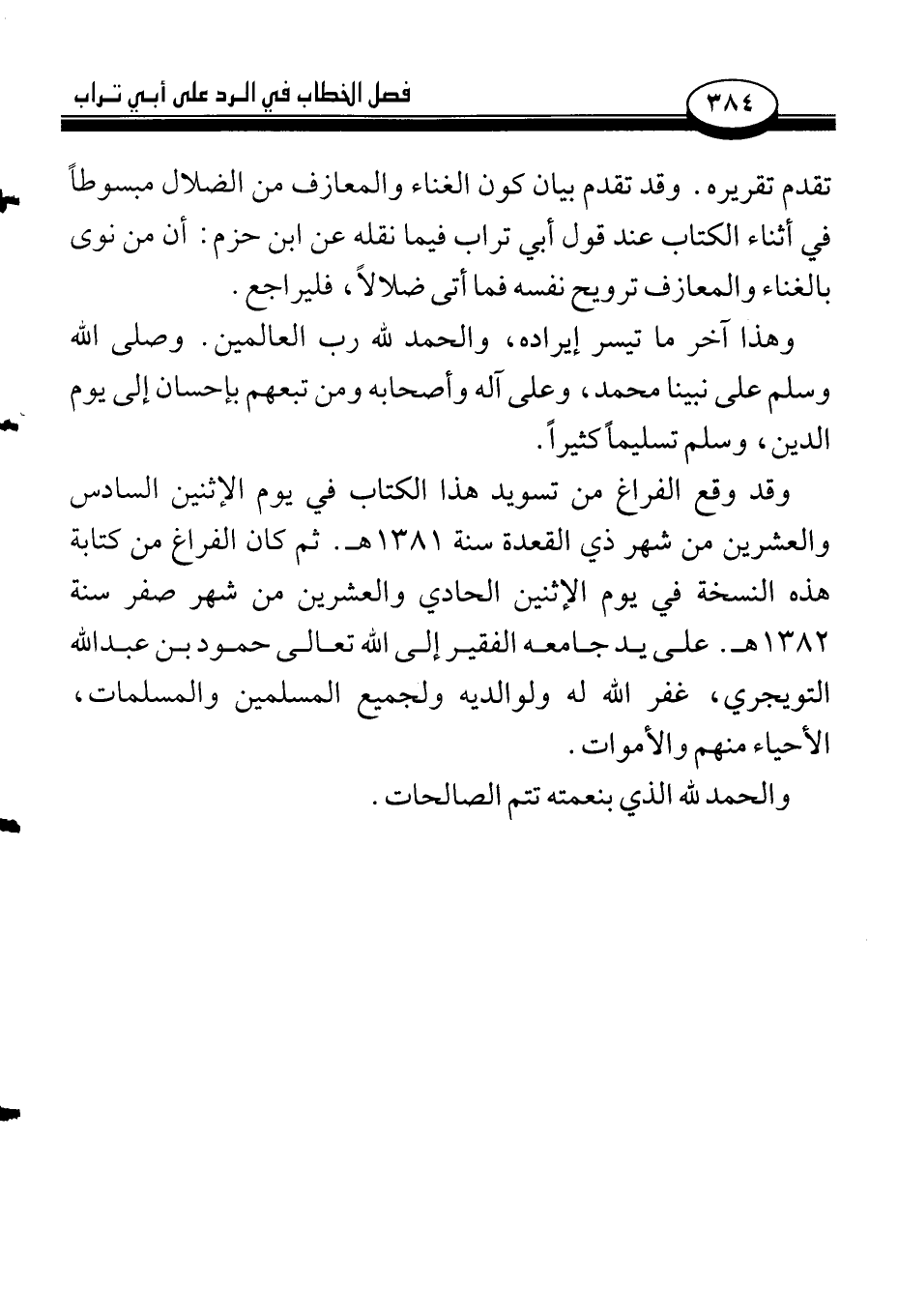 وقد وقع الفراغ من تسويد هذا الكتاب في يوم الإثنين السادس والعشرين من شهر ذي القعدة سنة 1381هـ. ثم كان الفراغ من كتابة هذه النسخة في يوم الإثنين الحادي والعشرين من شهر صفر سنة 1382هـ. على يد جامعه الفقير إلى الله تعالى حمود بن عبد الله التويجري، غفر الله له ولوالديه ولجميع المسلمين والمسلمات، الأحياء منهم والأموات.