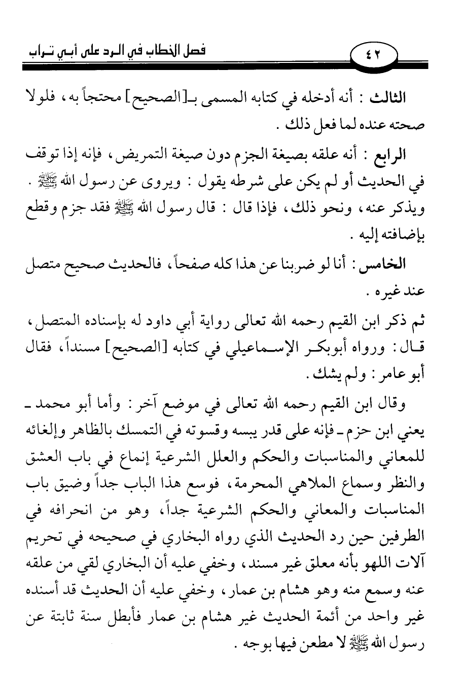 وقال ابن القيم رحمه الله تعالى في موضع آخر: وأما أبو محمد - يعني ابن حزم - فإنه على قدر يبسه وقسوته في التمسك بالظاهر وإلغائه للمعاني والمناسبات والحكم والعلل الشرعية إنماع في باب العشق والنظر وسماع الملاهي المحرمة، فوسع هذا الباب جداً وضيق باب المناسبات والمعاني والحكم الشرعية جداً، وهو من انحرافه في الطرفين حين رد الحديث الذي رواه البخاري في صحيحه في تحريم آلات اللهو بأنه معلق غير مسند، وخفي عليه أن البخاري لقي من علقه عنه وسمع منه وهو هشام بن عمار، وخفي عليه أن الحديث قد أسنده غير واحد من أئمة الحديث غير هشام بن عمار فأبطل سنة ثابتة عن رسول الله صلى الله عليه وسلم لا مطعن فيها بوجه.