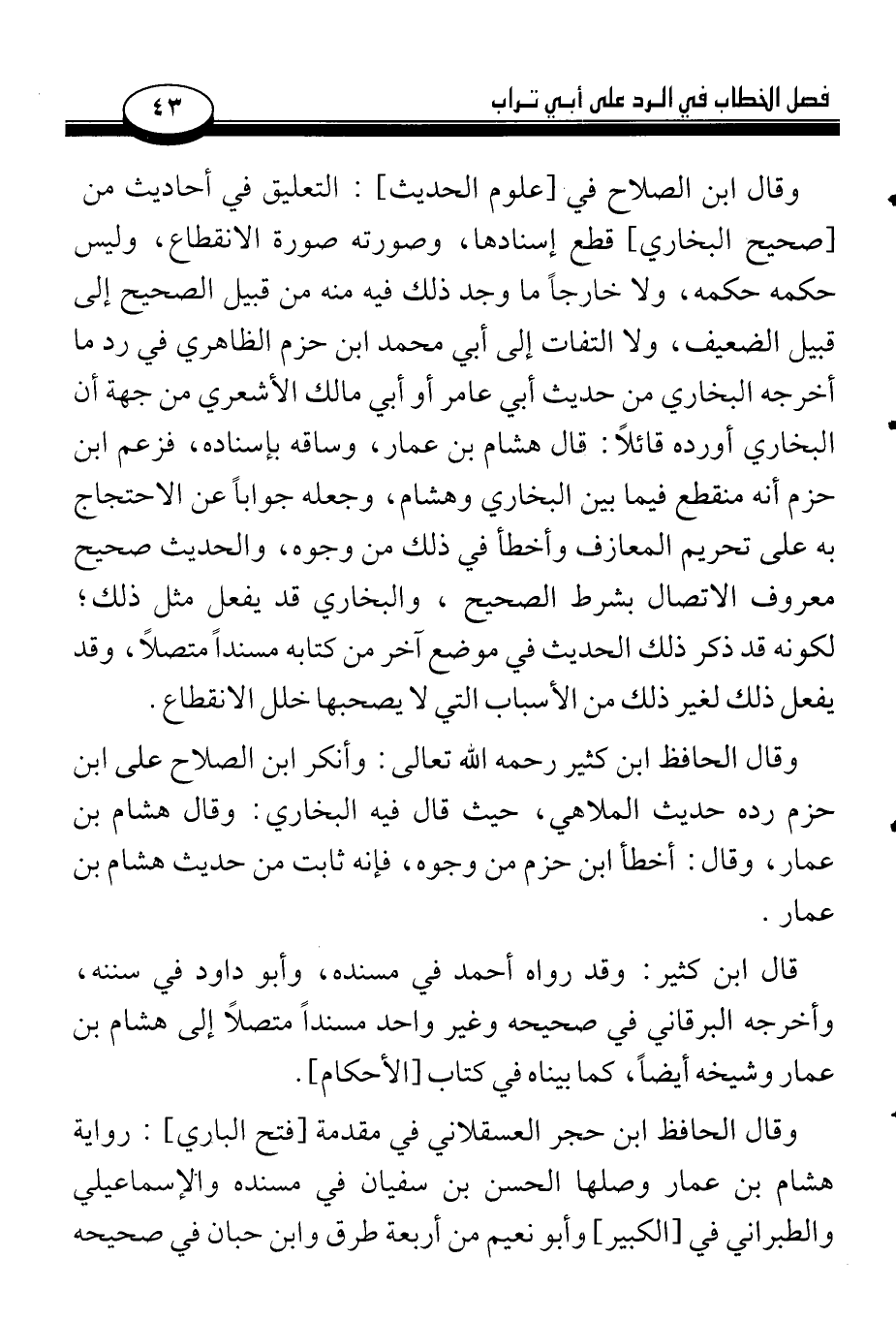 وقال الحافظ ابن كثير رحمه الله تعالى: وأنكر ابن الصلاح على ابن حزم رده حديث الملاهي، حيث قال فيه البخاري: وقال هشام بن عمار، وقال: أخطأ ابن حزم من وجوه، فإنه ثابت من حديث هشام بن عمار.