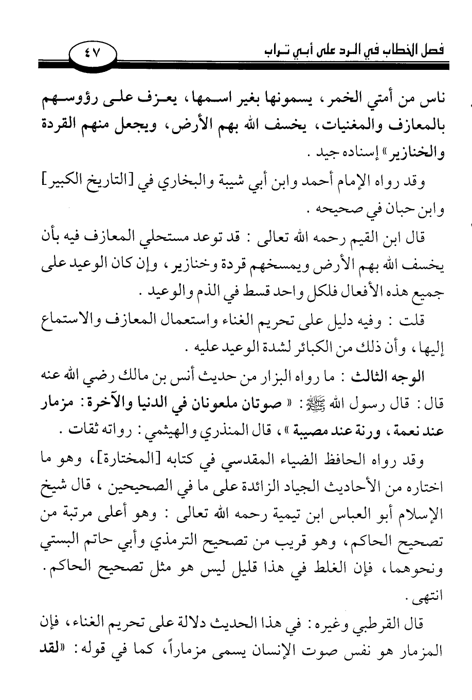 ناس من أمتي الخمر، يسمونها بغير اسمها، يعزف على رؤوسهم بالمعازف والمغنيات، يخسف الله بهم الأرض، ويجعل منهم القردة والخنازير» إسناده جيد.
