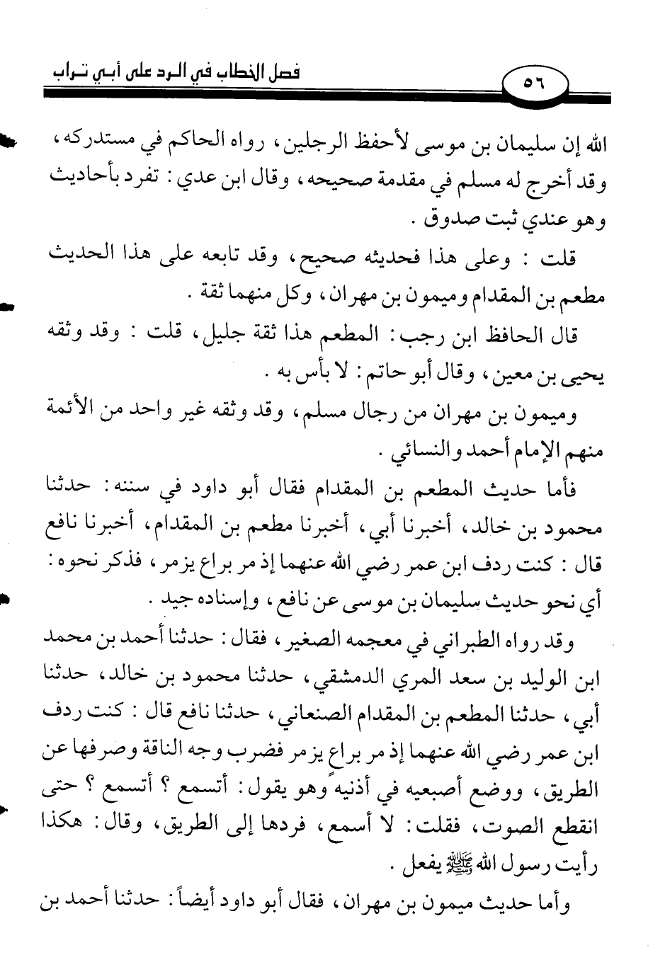 فأما حديث المطعم بن المقدام فقال أبو داود في سننه: حدثنا محمود بن خالد، أخبرنا أبي، أخبرنا المطعم بن المقدام، أخبرنا نافع قال: كنت ردف ابن عمر رضي الله عنهما إذ مر براع يزمر، فذكره نحوه: أي نحو حديث سليمان بن موسى عن نافع، وإسناده جيد.