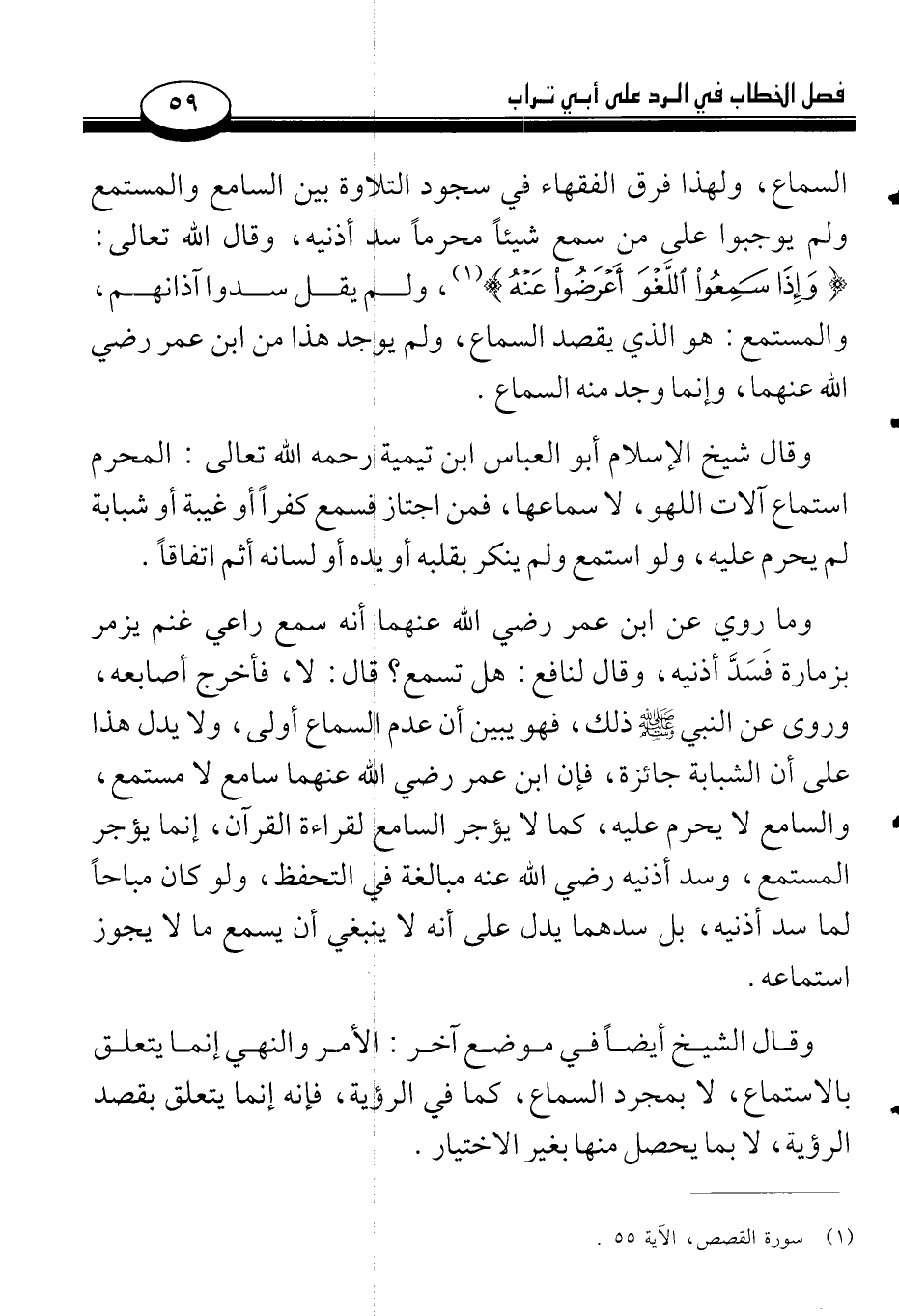 السماع، ولهذا فرق الفقهاء في سجود التلاوة بين السامع والمستمع ولم يوجبوا على من سمع شيئاً محرماً سد أذنيه، وقال الله تعالى: {وَإِذَا سَمِعُوا اللَّغْوَ أَعْرَضُوا عَنْهُ} (¬1)، ولم يقل سدوا آذانهم، والمستمع: هو الذي يقصد السماع، ولم يوجد هذا من ابن عمر رضي الله عنهما، وإنما وجد منه السماع.