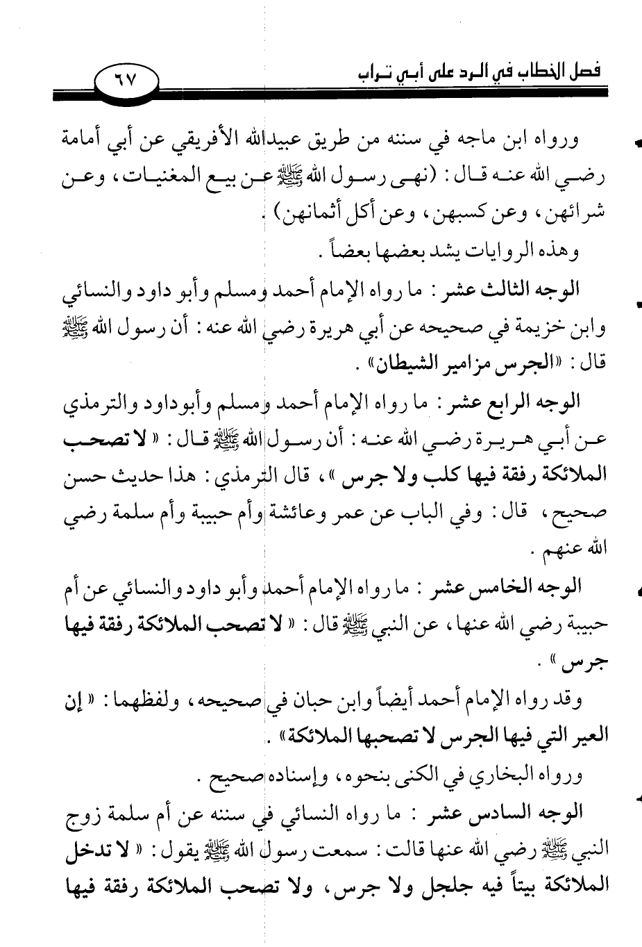 الوجه الرابع عشر: ما رواه الإمام أحمد ومسلم وأبو داود والترمذي عن أبي هريرة رضي الله عنه: أن رسول الله صلى الله عليه وسلم قال: «لا تصحب الملائكة رفقة فيها كلب ولا جرس»، قال الترمذي: هذا حديث حسن صحيح، قال: وفي الباب عن عمر وعائشة وأم حبيبة وأم سلمة رضي الله عنهم.