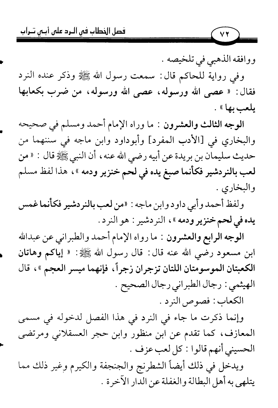 الوجه الثالث والعشرون: ما رواه الإمام أحمد ومسلم في صحيحه والبخاري في [الأدب المفرد] وأبو داود وابن ماجه في سننهما من حديث سليمان بن بريدة عن أبيه رضي الله عنه، أن النبي صلى الله عليه وسلم قال: «من لعب بالنردشير فكأنما صبغ يده في لحم خنزير ودمه»، هذا لفظ مسلم والبخاري.