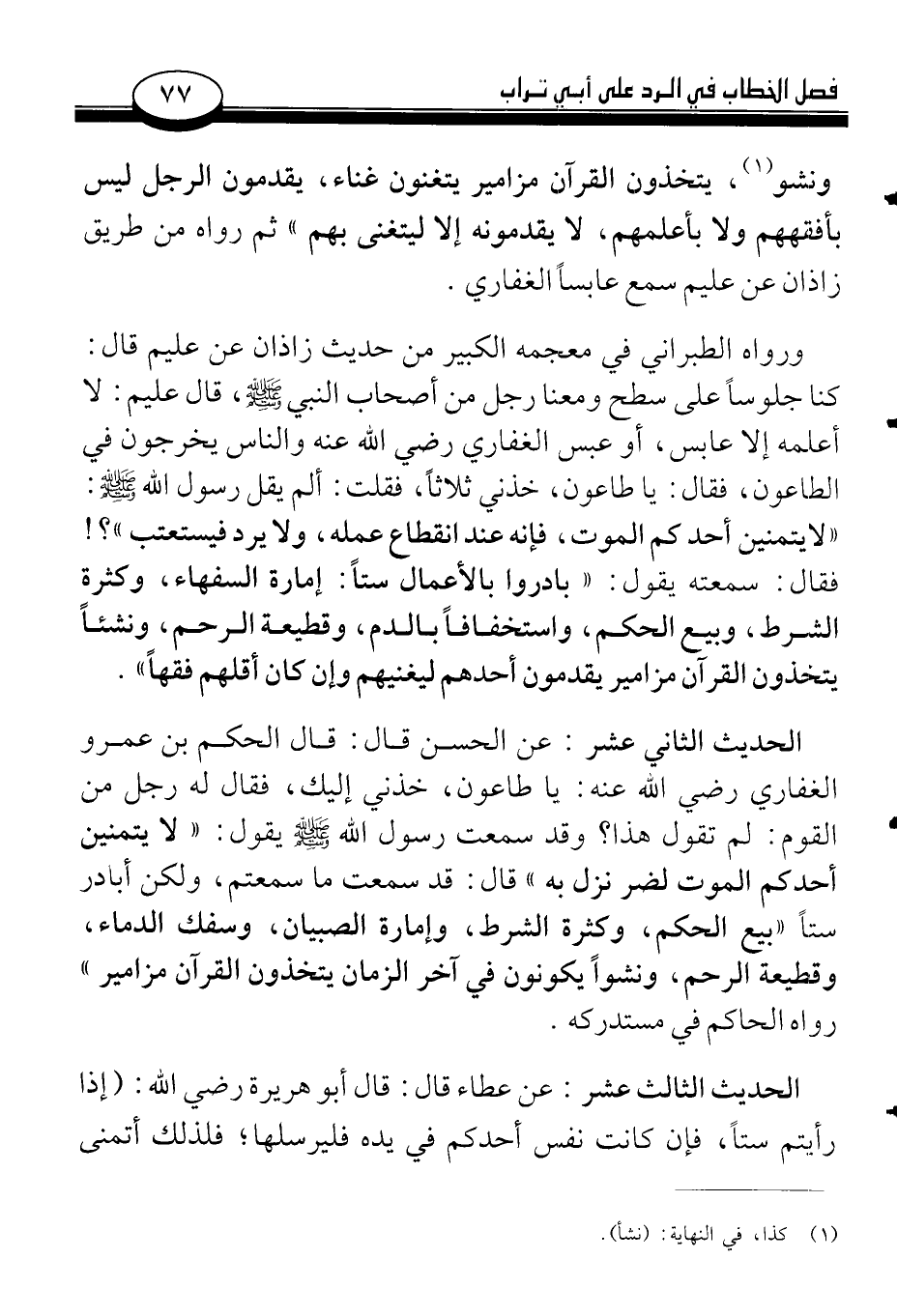 الحديث الثاني عشر: عن الحسن قال: قال الحكم بن عمرو الغفاري رضي الله عنه: يا طاعون، خذني إليك، فقال له رجل من القوم: لم تقول هذا؟ وقد سمعت رسول الله صلى الله عليه وسلم يقول: «لا يتمنين أحدكم الموت لضر نزل به» قال: قد سمعت ما سمعتم، ولكن أبادر ستاً «بيع الحكم، وكثرة الشرط، وإمارة الصبيان، وسفك الدماء، وقطيعة الرحم، ونشواً يكونون في آخر الزمان يتخذون القرآن مزامير» رواه الحاكم في مستدركه.