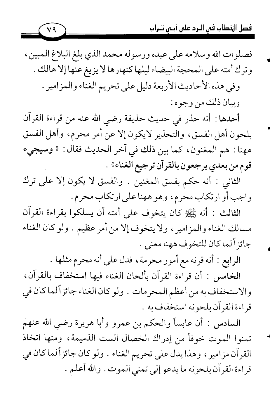 الثالث: أنه صلى الله عليه وسلم كان يتخوف على أمته أن يسلكوا بقراءة القرآن مسالك الغناء والمزامير، ولا يتخوف إلا من أمر عظيم. ولو كان الغناء جائزاً لما كان للتخوف ههنا معنى.