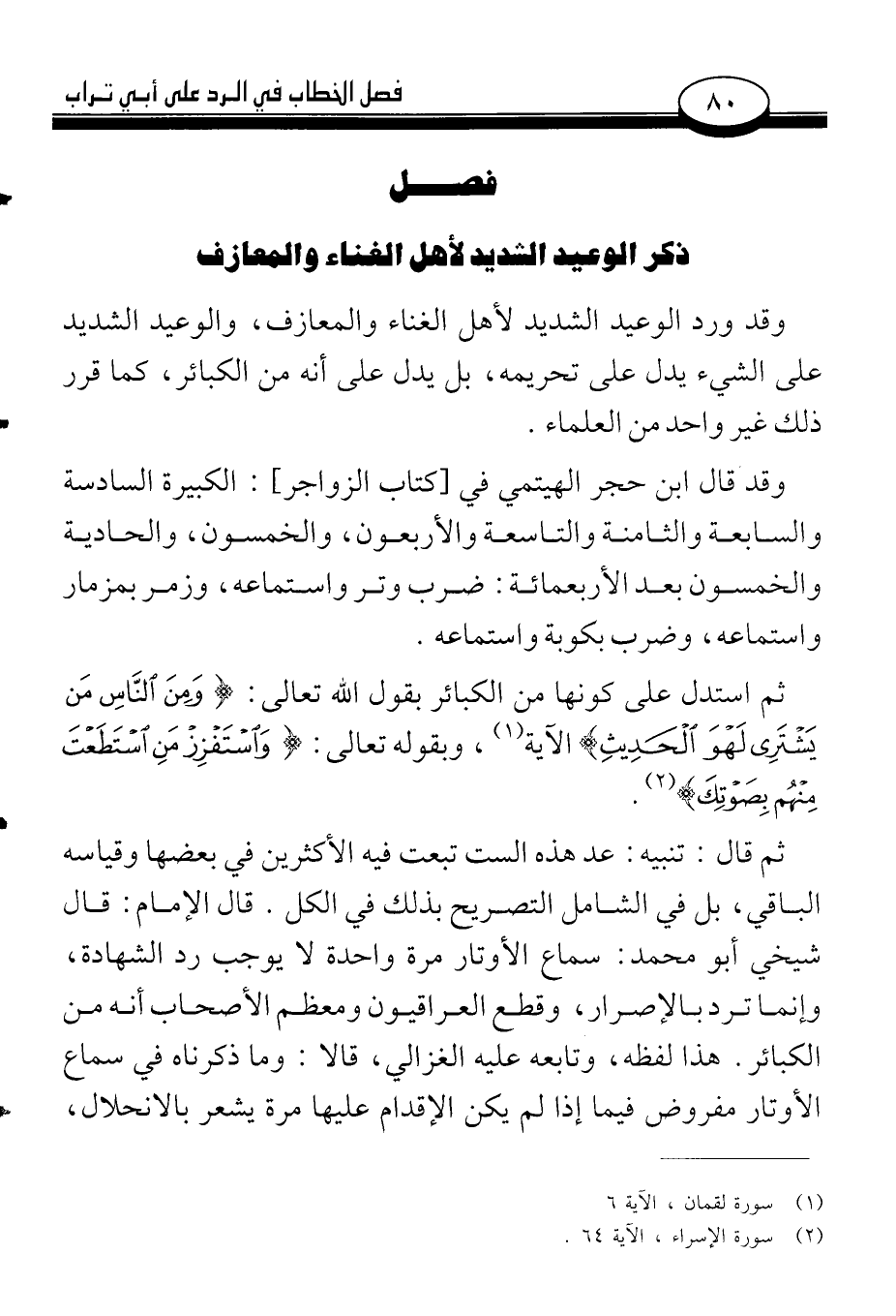 ثم استدل على كونها من الكبائر بقول الله تعالى: {وَمِنَ النَّاسِ مَن يَشْتَرِي لَهْوَ الْحَدِيثِ} الآية (¬1)، وبقوله تعالى: {وَاسْتَفْزِزْ مَنِ اسْتَطَعْتَ مِنْهُمْ بِصَوْتِك} (¬2).