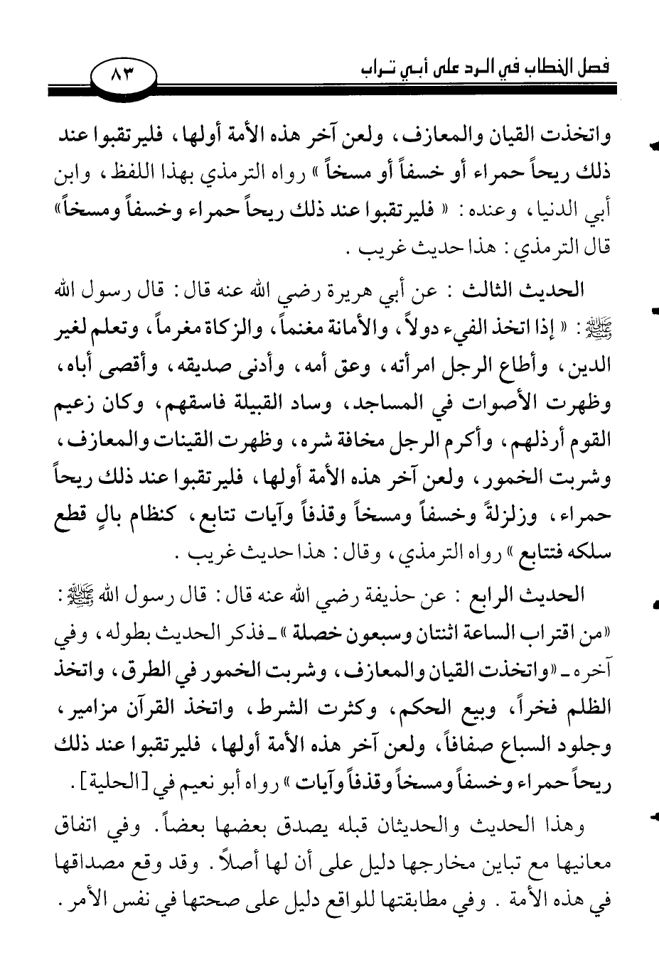واتخذت القيان والمعازف، ولعن آخر هذه الأمة أولها، فليرتقبوا عند ذلك ريحاً حمراء أو خسفاً أو مسخاً» رواه الترمذي بهذا اللفظ، وابن أبي الدنيا، وعنده: «فليرتقبوا عند ذلك ريحاً حمراء وخسفاً ومسخاً» قال الترمذي: هذا حديث غريب.