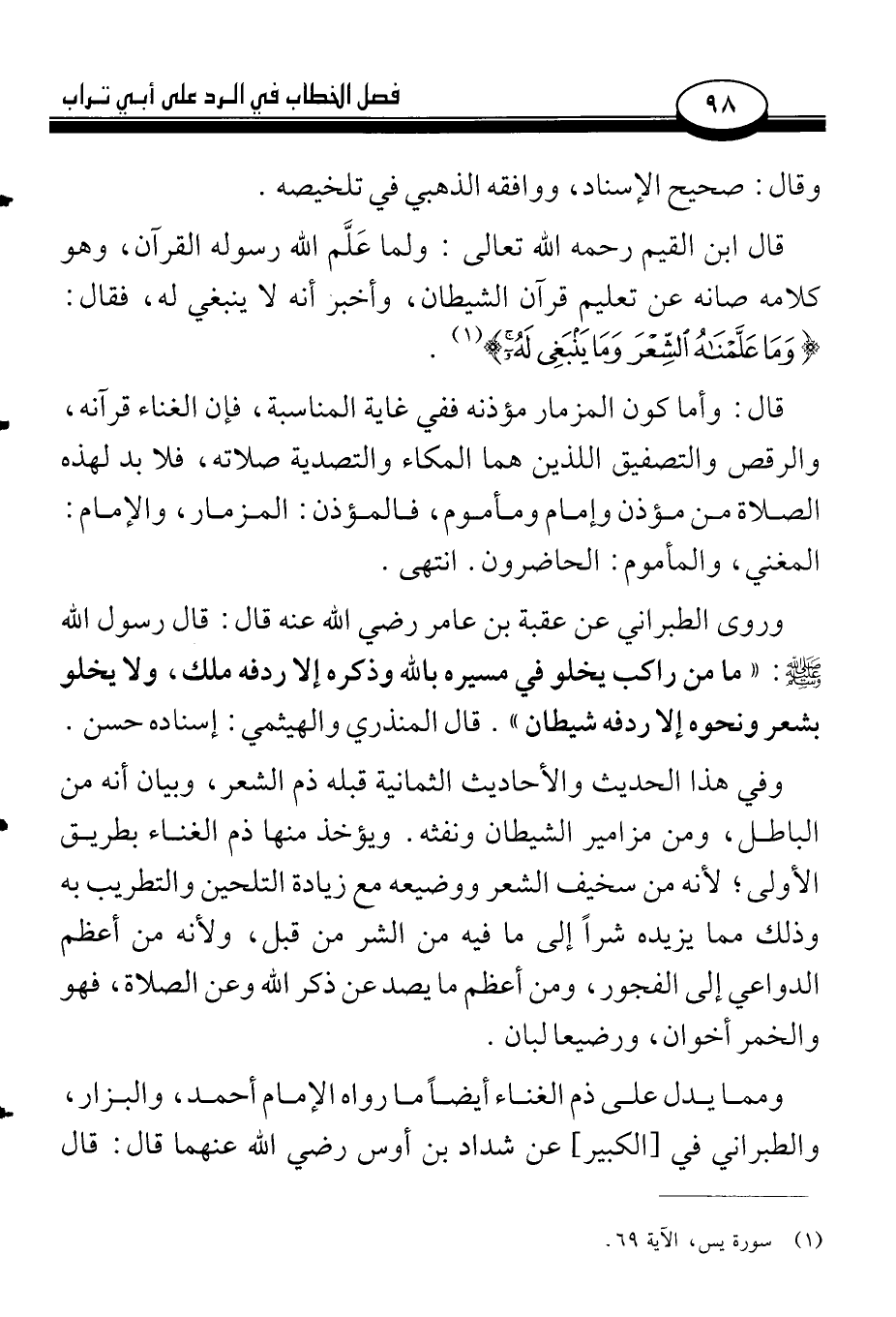 وفي هذا الحديث والأحاديث الثمانية قبله ذم الشعر، وبيان أنه من الباطل، ومن مزامير الشيطان ونفثه. ويؤخذ منها ذم الغناء بطريق الأولى؛ لأنه من سخيف الشعر ووضيعه مع زيادة التلحين والتطريب به وذلك مما يزيده شراً إلى ما فيه من الشر من قبل، ولأنه من أعظم الدواعي إلى الفجور، ومن أعظم ما يصد عن ذكر الله وعن الصلاة، فهو والخمر أخوان، ورضيعا لبان.