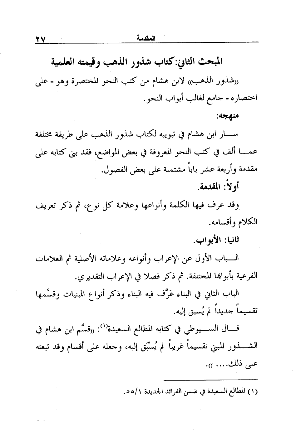 قال السيوطي في كتابه المطالع السعيدة1: "قسَّم ابن هشام في الشذور المبني تقسيماً غريباً لم يُسْبَق إليه، وجعله على أقسام وقد تبعته على ذلك..".