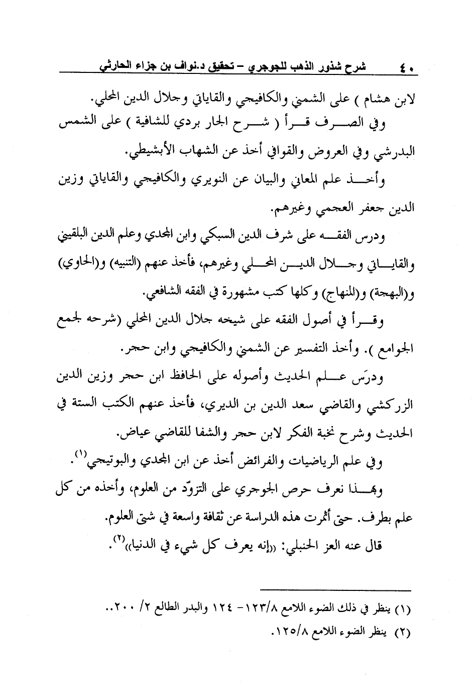 وفي الصرف قرأ (شرح الجار بردي للشافية) على الشمس البدرشي وفي العروض والقوافي أخذ عن الشهاب الأبشيطي.