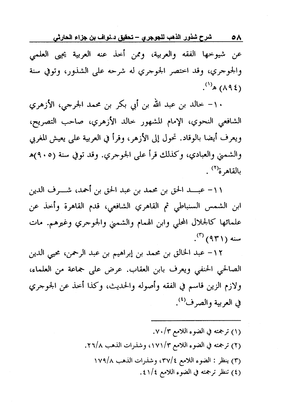 10- خالد بن عبد الله بن أبي بكر بن محمد الجرجي، الأزهري الشافعي النحوي، الإمام المشهور خالد الأزهري، صاحب التصريح، ويعرف أيضا بالوقاد. تحول إلى الأزهر، وقرأ في العربية على يعيش المغربي والشمني والعبادي، وكذلك قرأ على الجوجري. وقد توفي سنة (905) هـ بالقاهرة2.