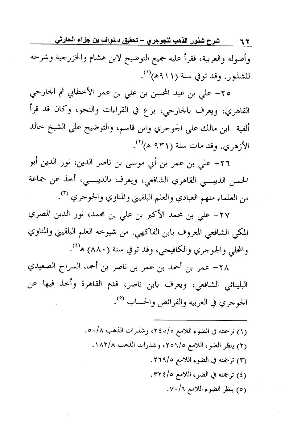 25- علي بن عبد المحسن بن علي بن عمر الأخطابي ثم الجارحي القاهري، ويعرف بالجارحي، برع في القراءات والنحو، وكان قد قرأ ألفية ابن مالك على الجوجري وابن قاسم، والتوضيح على الشيخ خالد الأزهري. وقد مات سنة (931 هـ) 2.